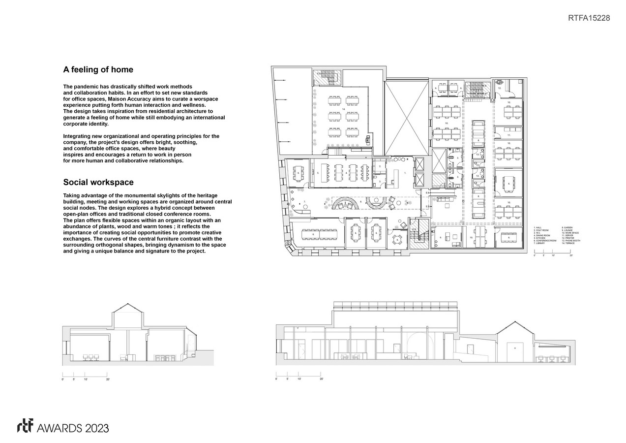 The pandemic has drastically shifted work methods and collaboration habits. In an effort to set new standards for office spaces, Maison Accuracy aims to curate a worspace experience putting forth human interaction and wellness. The design takes inspiration from residential architecture to generate a feeling of home while still embodying an international corporate identity. Applying an analytical approach based on the company’s operations, the architects proposed a new layout model based on flexibility, comfort, and the creation of common spaces.