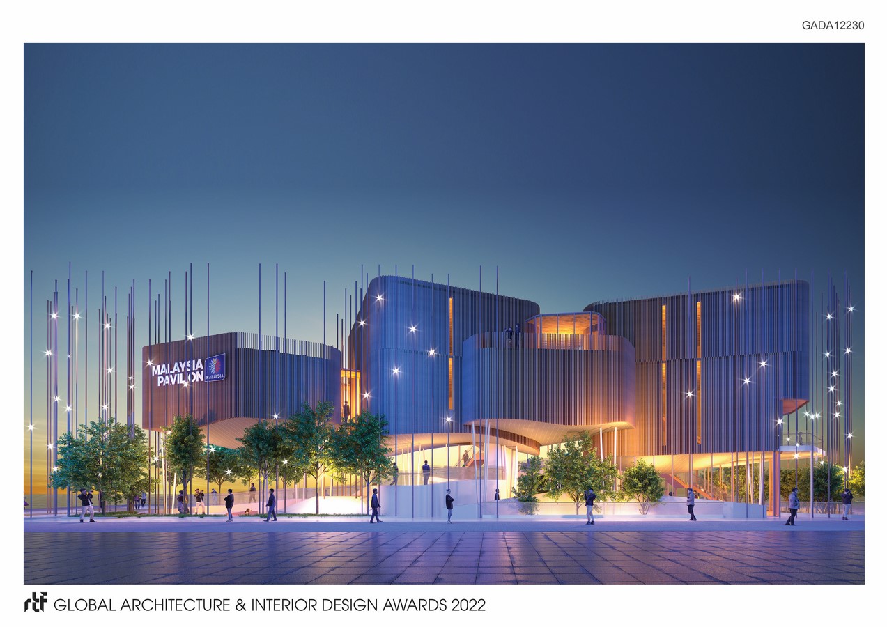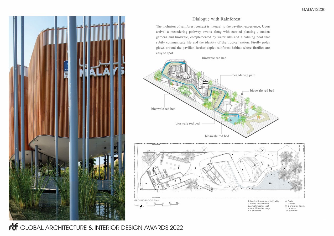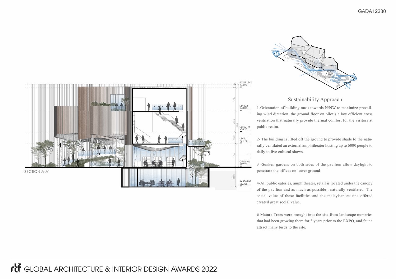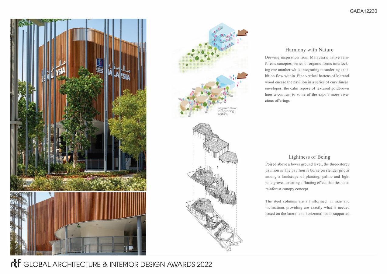 Concept is inspired by traditional lightweight Malay houses on stilts of the past and the understory of rain forest treetops. Poised above a lower ground level, the three-storey pavilion with interlocking mass, appearing suspended in mid-air courtesy of slender pilotis.