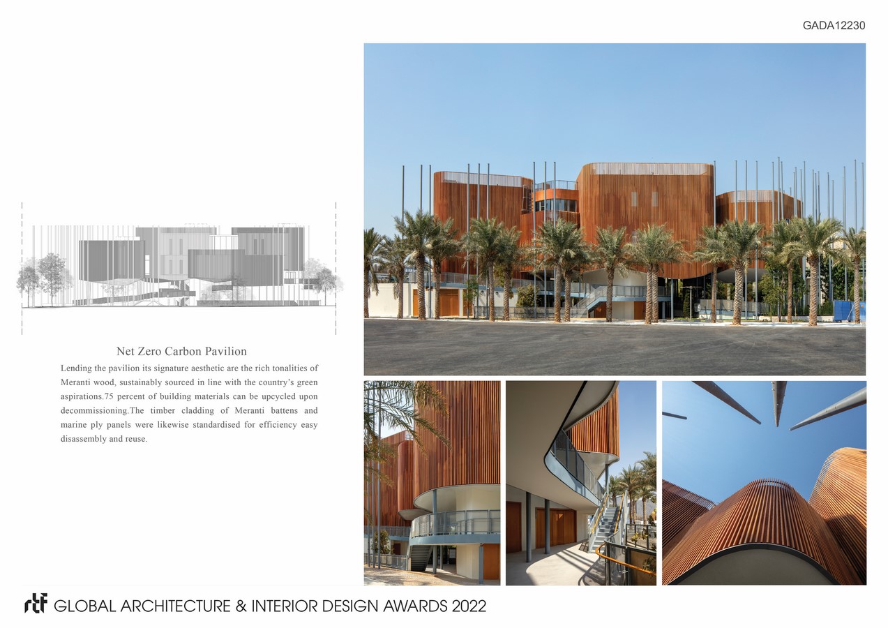 Floating above the ground, the pavilion adopts the term “touching the ground lightly”, a metaphor for the pavilion’s low carbon footprint. Advancing net zero by using geographical advantage in Dubai to harvest daylight, adopting passive strategies as the pavilion naturally ventilates its visitors approaching pathway. The material selection of Meranti timber itself holds the low carbon footprint, structure was standardized for efficiency, easy disassembly and reuse. 75 percent of building materials that can be upcycled during decommissioning.