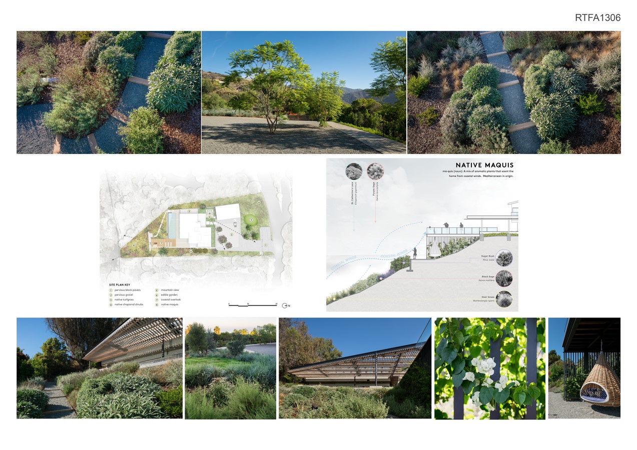 The hillside garden incorporates plant materials native to the Santa Monica Mountains as well as drought-tolerant Mediterranean materials. Outdoor amenity areas are designed to maximize the extent of the property and to take advantage of the incredible views of the ocean and the mountains. The goal is to create a visually compelling terrain that minimizes resource use and aims to redefine luxury in an era of diminishing hydrological resources. The garden references the rugged beauty of the surrounding chaparral, where the native ecosystem thrives without resource inputs. The landscape is conceived of as an extension of this native ecology and is defined by its embeddedness in the greater natural setting.