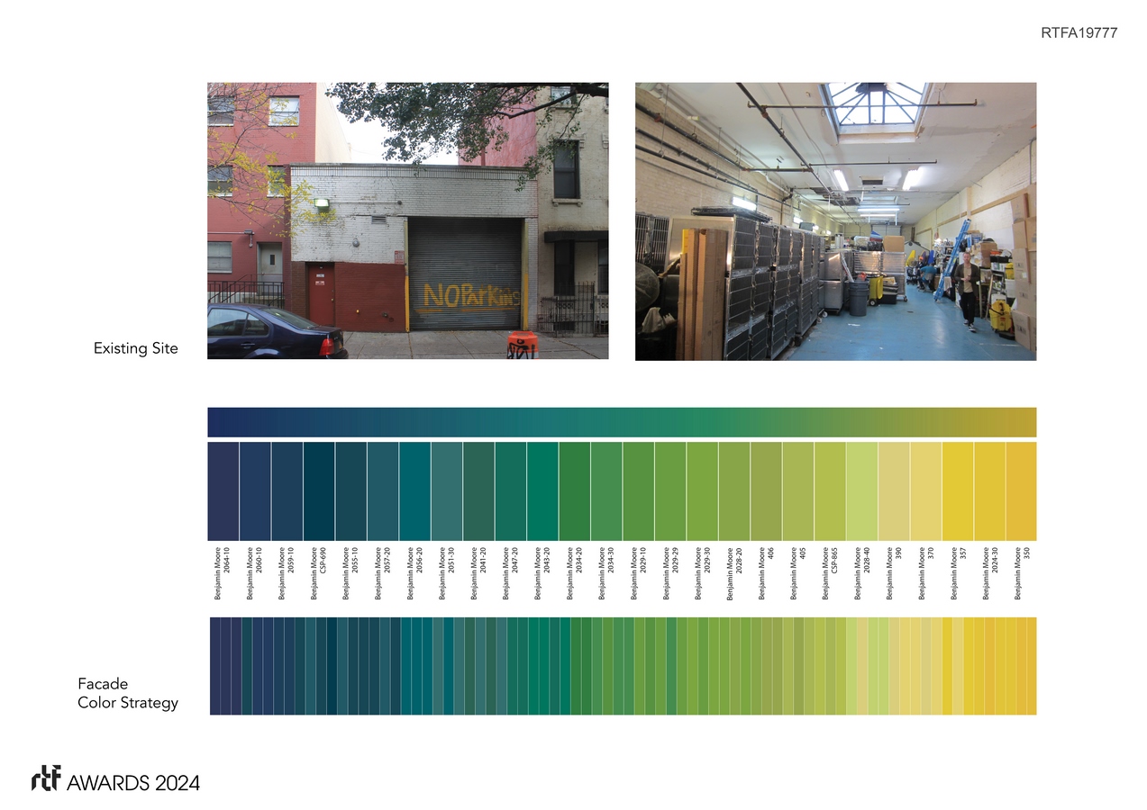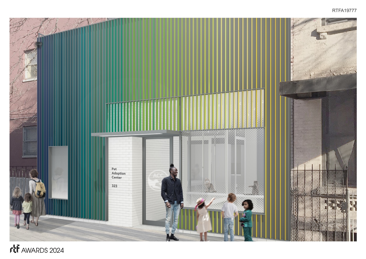 The new facade celebrates pedestrian life, creating an engaging attraction for nearby residents and potential pet adopters. The garage door opening is repurposed as a viewing window into the cat colony. This large area of south-facing glazing brings natural light deep into the building’s public spaces. The new façade is a “rain-screen.” It has a series of 3 ½” fins that create a lenticular effect as one walks down the street. Twenty-five distinct colors spread over seventy-five individual surfaces, flicker from yellow to dark blue. From the south side of the street, the color is more subdued as part of the optical quality. The existing brick at the entry is painted white.