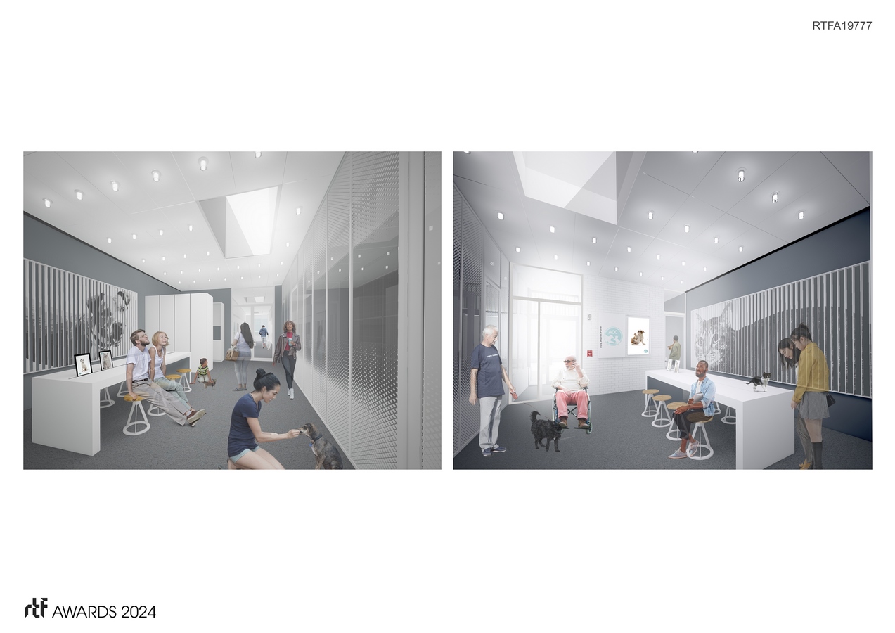 The interior design is based on animal safety/best practices though the design intention varies strategically from standard models for pet adoption facilities. We provide a large welcome area for community gatherings where staff sit together with adoptive families at a shared table.