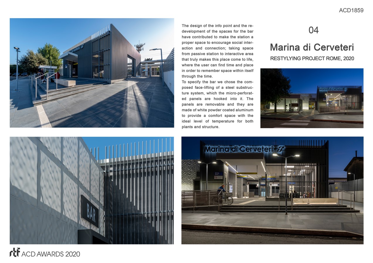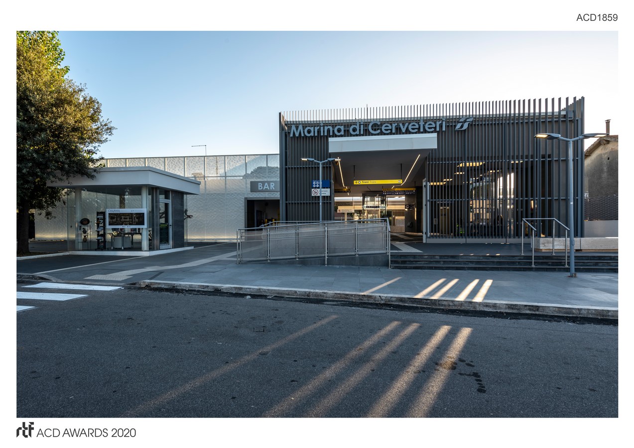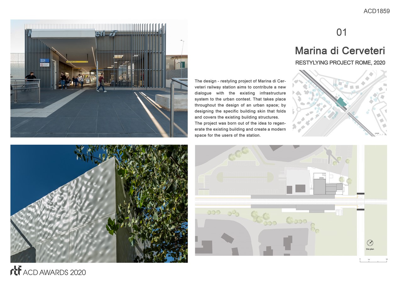The design – restyling project of Marina di Cerveteri railway station aims to contribute a new dialogue with the existing infrastructure system to the urban contest. That takes place throughout the design of an urban space; by designing the specific building skin that folds and covers the existing building structures.