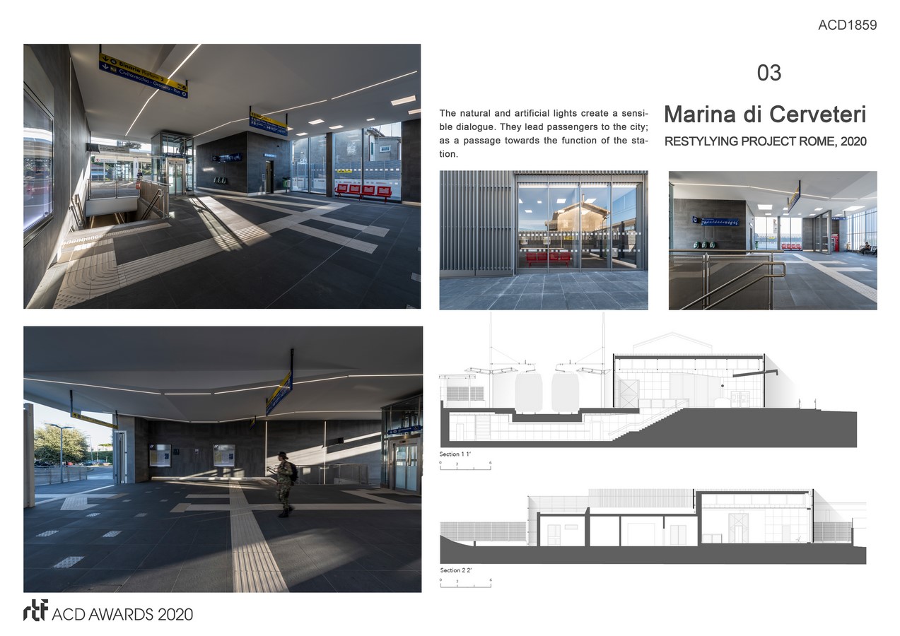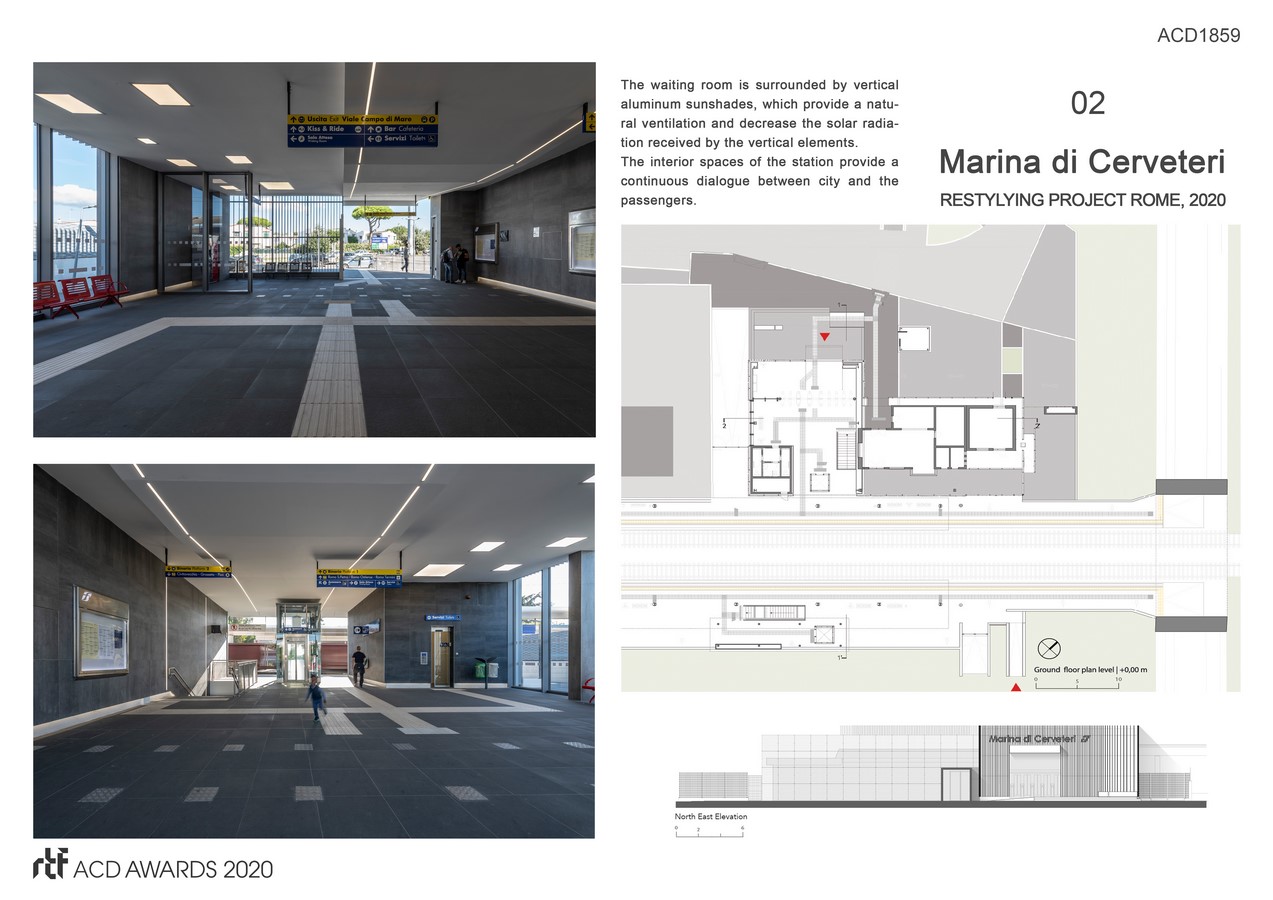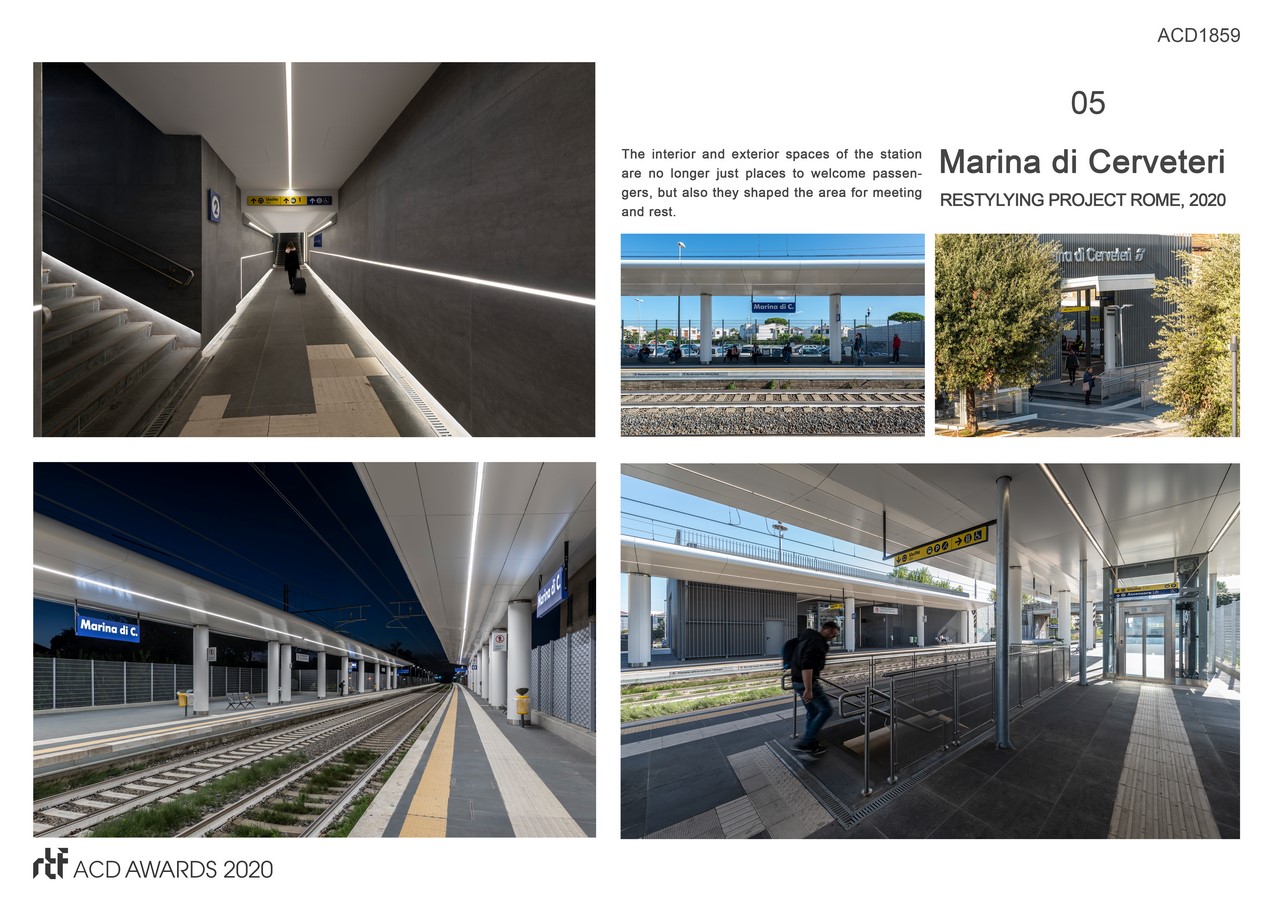 The design – restyling project of Marina di Cerveteri railway station aims to contribute a new dialogue with the existing infrastructure system to the urban contest. That takes place throughout the design of an urban space; by designing the specific building skin that folds and covers the existing building structures.