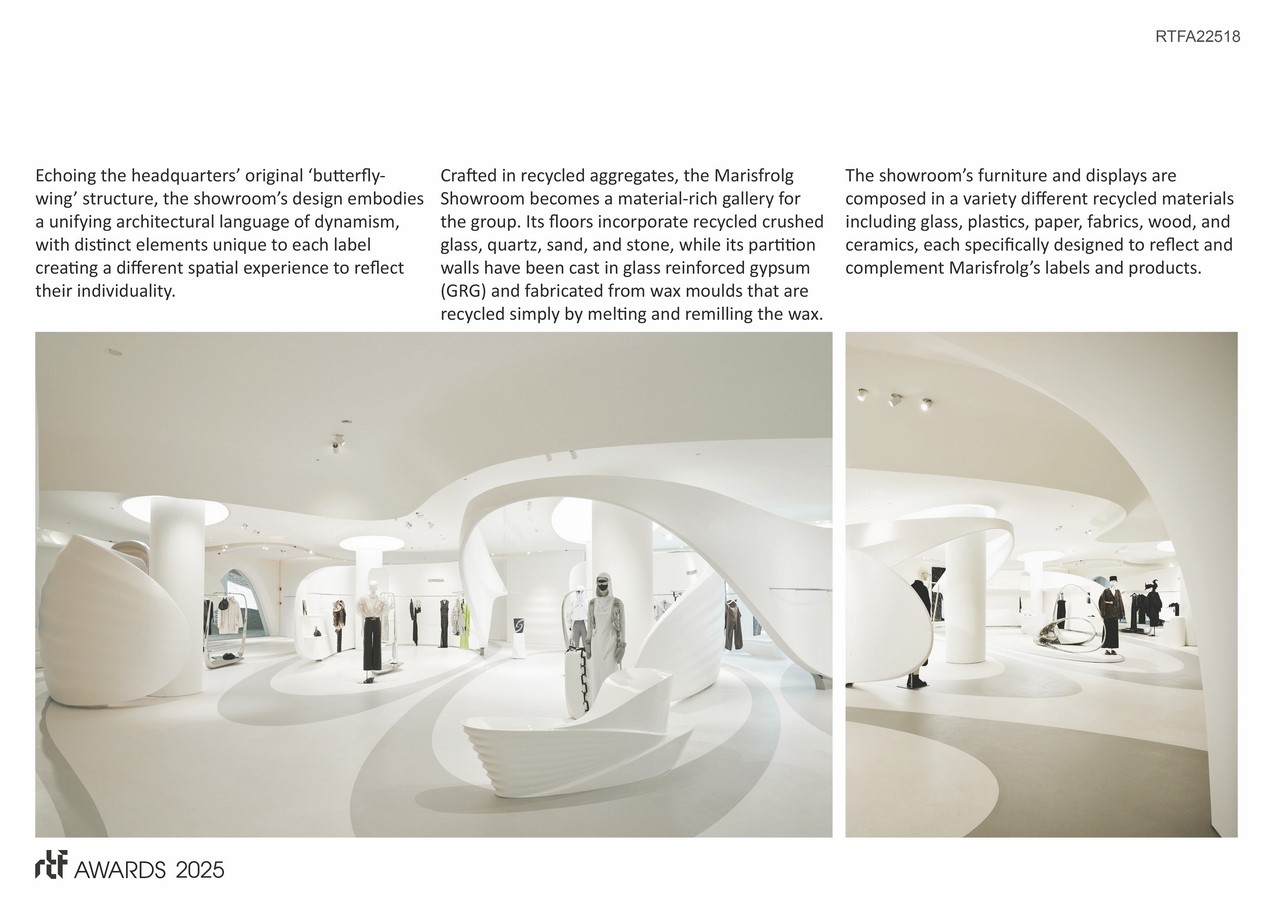 Crafted in recycled aggregates, the Marisfrolg Showroom becomes a material-rich gallery for the group. Its floors incorporate recycled crushed glass, quartz, sand, and stone, while its partition walls have been cast in glass reinforced gypsum (GRG) and fabricated from wax moulds that are recycled simply by melting and remilling the wax,