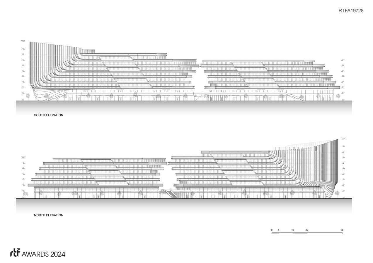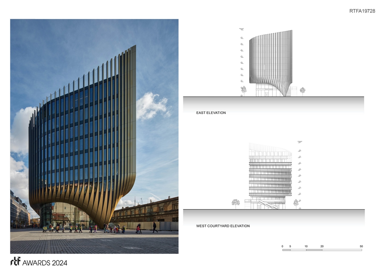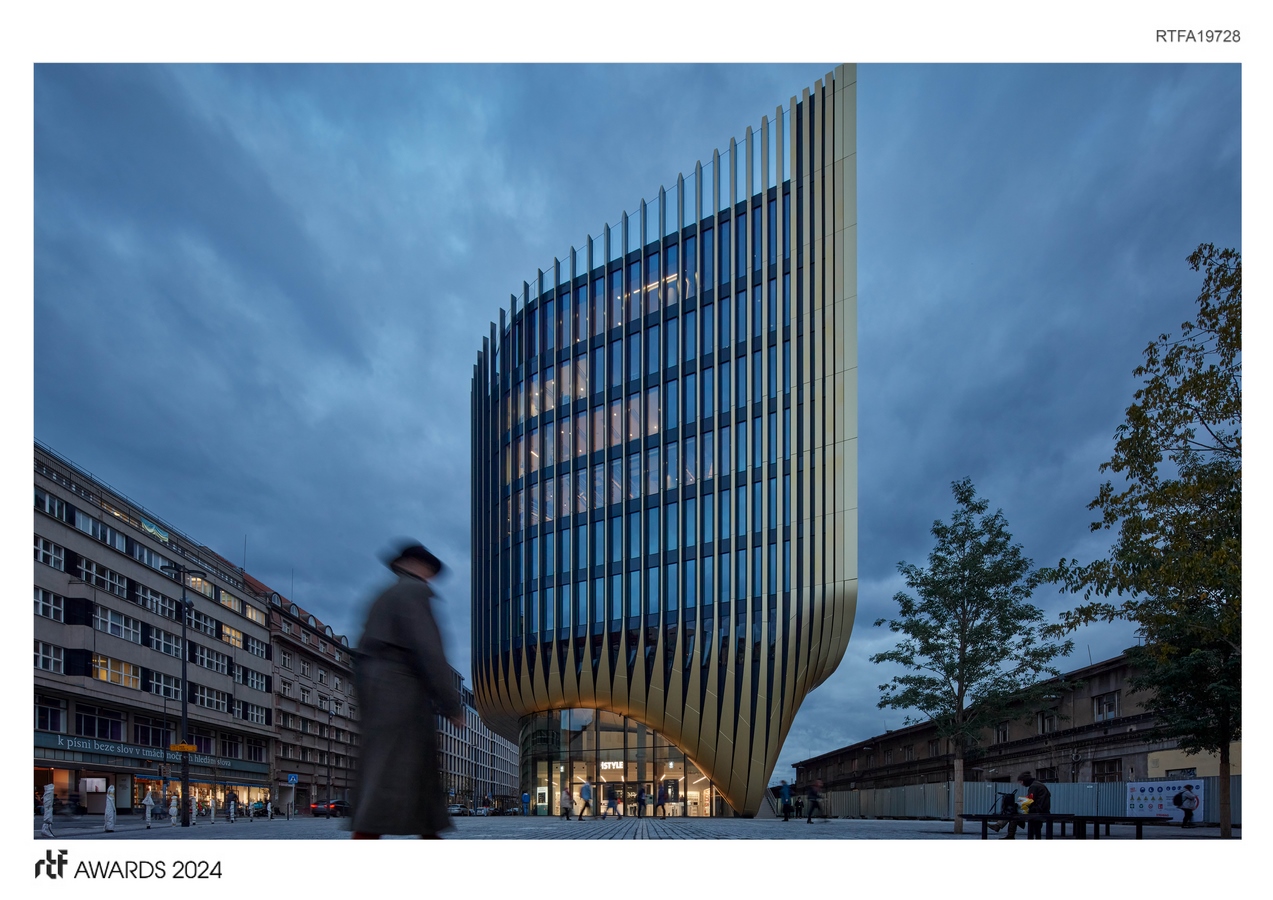 Located one kilometre east of the city centre’s Staroměstské Square, Masaryčka’s design establishes a dialogue with the architecture and urbanism of Prague’s Old Town – known as ‘the golden city of 100 spires’. External fins within Masaryčka’s façade contribute to solar shading in the summer and transform the project’s horizontal composition to the verticality of its western façade facing the spires of the Old Town.