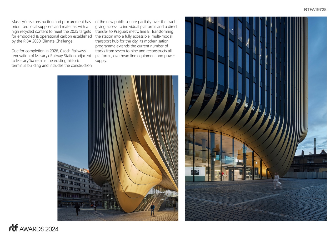 Bordered by Masaryk Station’s railway platforms to the south, Na Florenci street to the north, and the Wilsonova elevated freeway to the east, Masaryčka has been constructed on a derelict site that has stood abandoned for several decades. To the west, Masaryčka replaces the existing car park on Havlíčkova Boulevard with a new public square with interchanges between city’s rail, tram and bus networks; defining a welcoming gateway to the city for suburban and domestic rail passengers as well as those using the express rail link that is currently under-construction to Prague’s international airport.