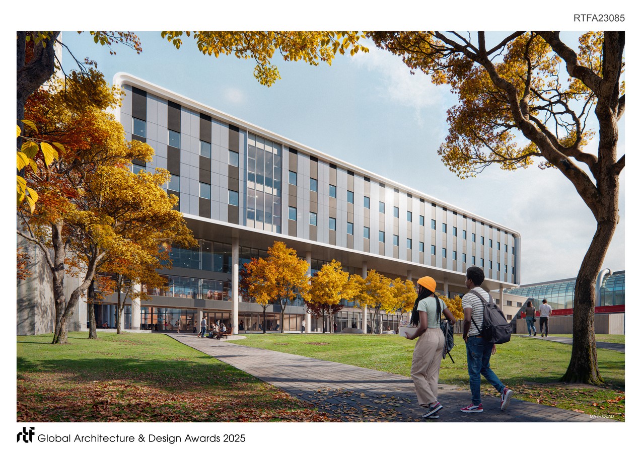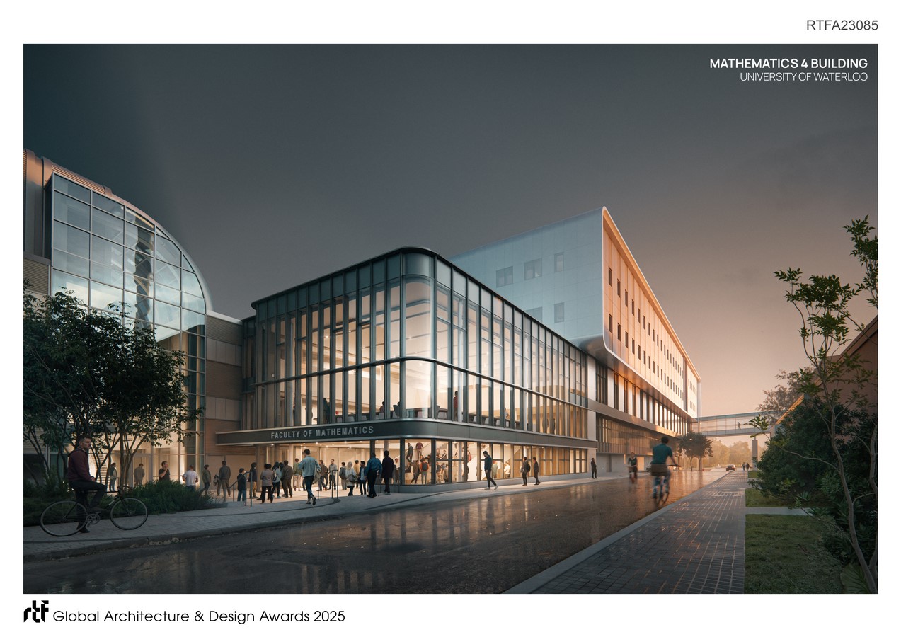 The Faculty of Mathematics at the University of Waterloo, the only dedicated mathematics faculty in North America, is a global leader in research and teaching. Yet its facilities have long lacked a social center point. At five storeys and 119,640 SF, Mathematics 4 (M4) establishes both a physical and symbolic heart for the faculty, uniting dispersed buildings while creating a bold new gateway to campus.