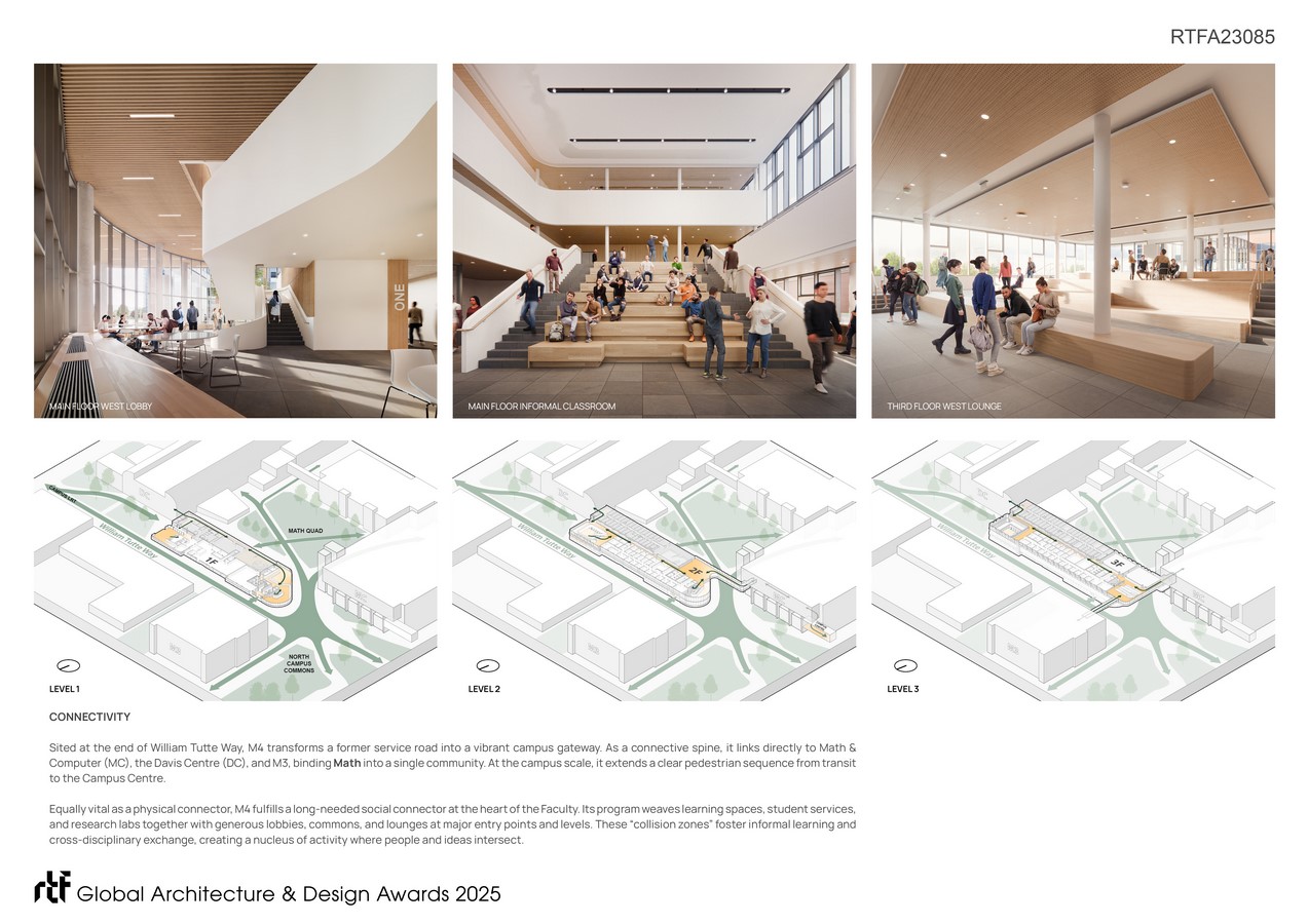 Equally vital to its role as a physical connector, M4 fulfills a long-identified need for a strong social connector at the heart of the Faculty of Mathematics. Its program weaves learning spaces, student services, offices, and research labs together with generous lobbies, commons, and lounges at major entry points and levels. These “collision zones” foster informal learning and cross-disciplinary exchange. By concentrating teaching, research, and support functions in one place, M4 creates a nucleus of activity—a hive of innovation where people and ideas intersect.