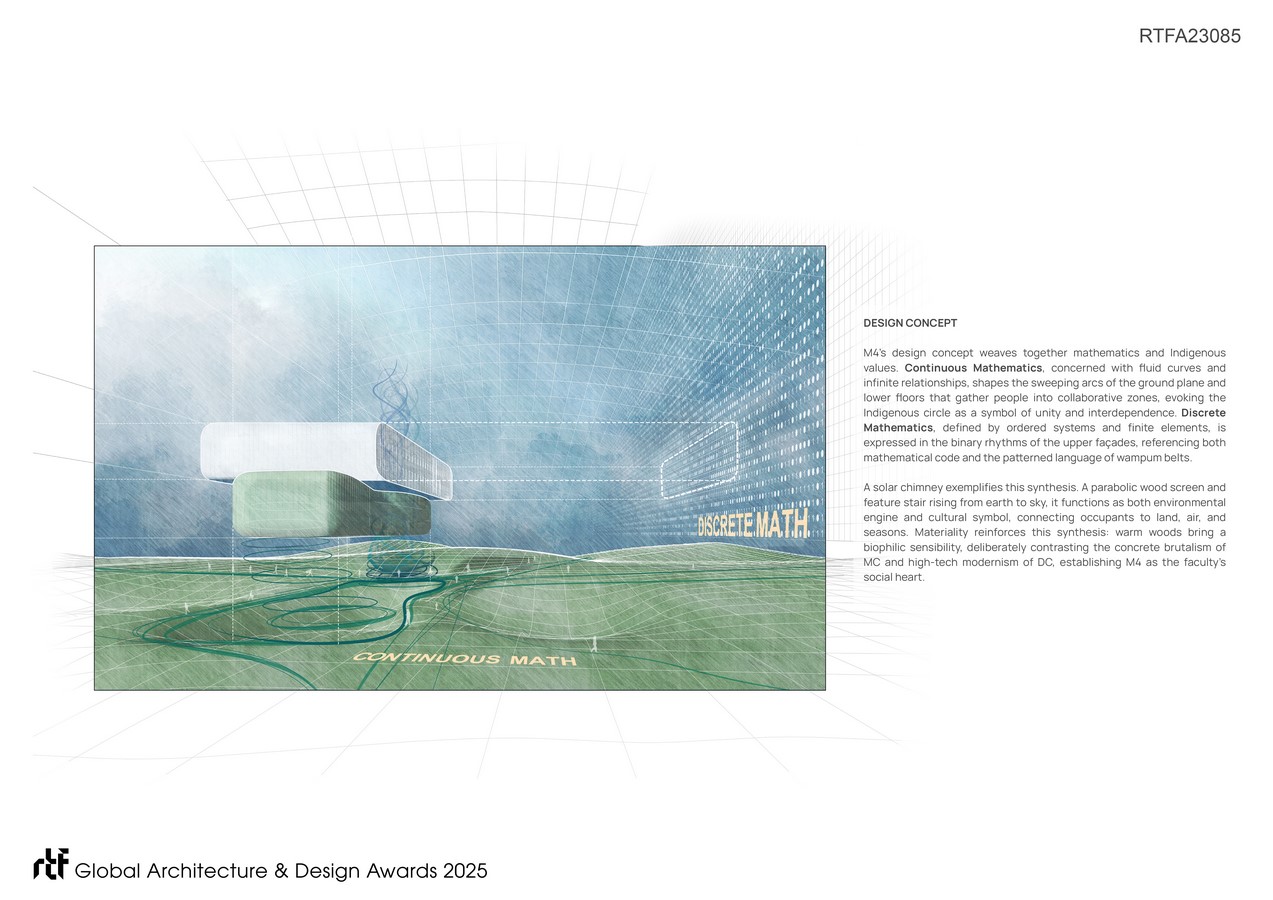 M4’s design concept weaves together mathematics and Indigenous culture. Continuous mathematics is expressed through curving lower levels that gather people into collaborative zones, evoking the Indigenous circle as a symbol of unity and renewal. Discrete mathematics is reflected in binary façade patterns, recalling both mathematical code and the patterned language of wampum belts.