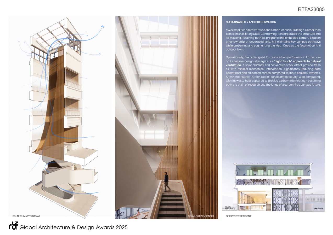 M4 exemplifies adaptive reuse and carbon-conscious design. Rather than demolish an existing Davis Centre wing, it incorporates the structure into its massing, retaining both café and office functions while reducing embodied carbon.