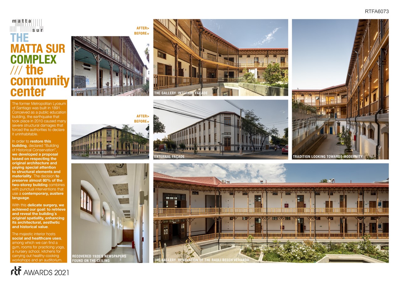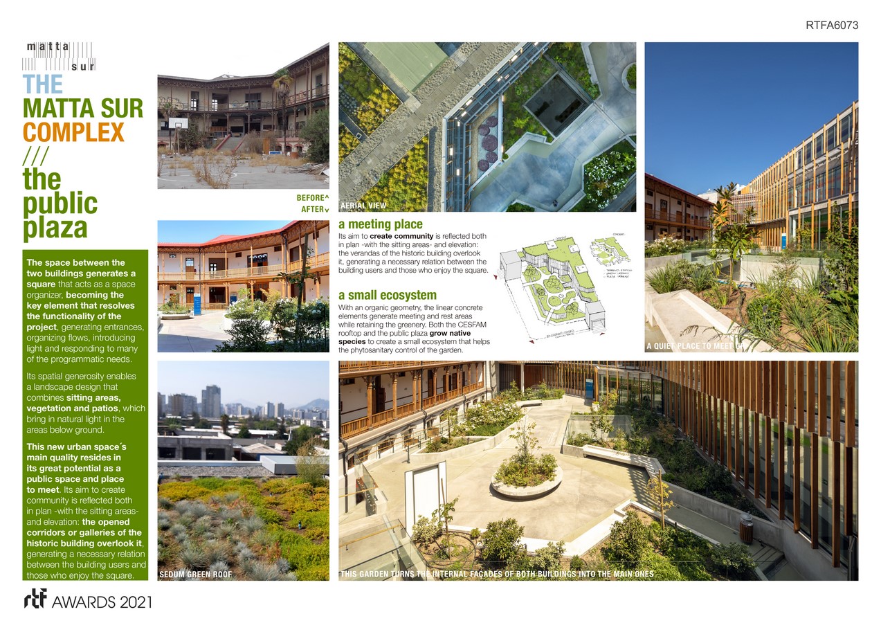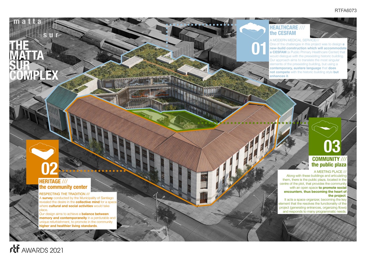 The city that takes good care of its cultural heritage is the city that listens to its past without neglecting its future. This delicate balance between memory and contemporaneity is what a perdurable architecture, committed to contribute to the society, provides. Those are the cornerstones for the Matta Sur Complex.