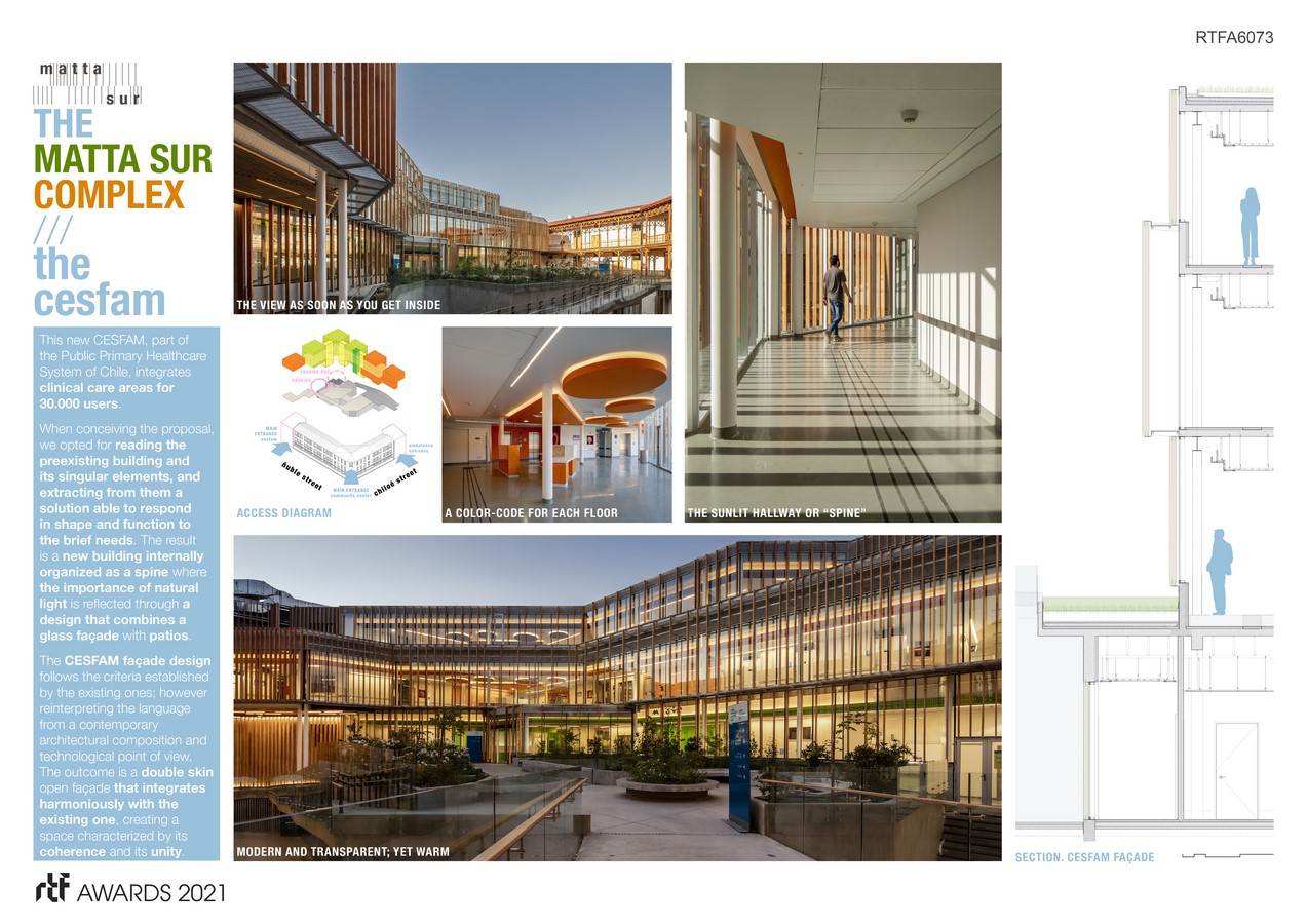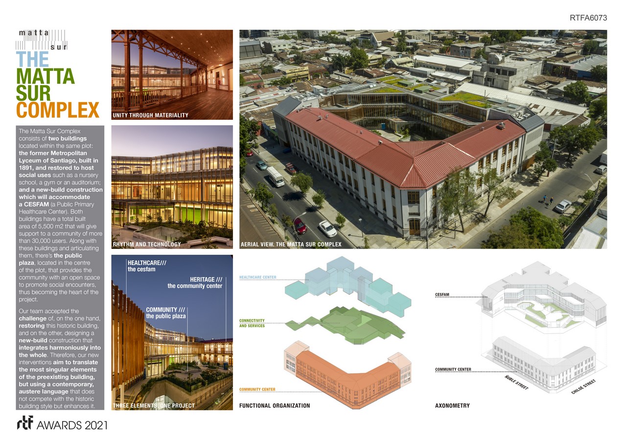 The Matta Sur Complex consists of two buildings located within the same plot: the former Metropolitan Lyceum of Santiago, built in 1891, and restored to host social uses such as a nursery school, a gym or an auditorium; and a new-build construction which will accommodate a CESFAM (a Public Primary Healthcare Center). Both buildings have a total built area of 5,500 m2 that will give support to a community of more than 30,000 users. Along with these buildings and articulating them, there’s the public plaza, located in the center of the plot, that provides the community with an open space to promote social encounters, thus becoming the heart of the project.