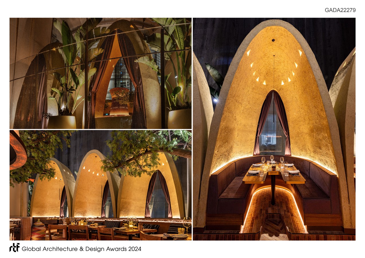 This project blends traditional African design elements and finishes in a very contemporary architectural aesthetic, creating an immersive dining experience through the creation of a transcendent village within a city.