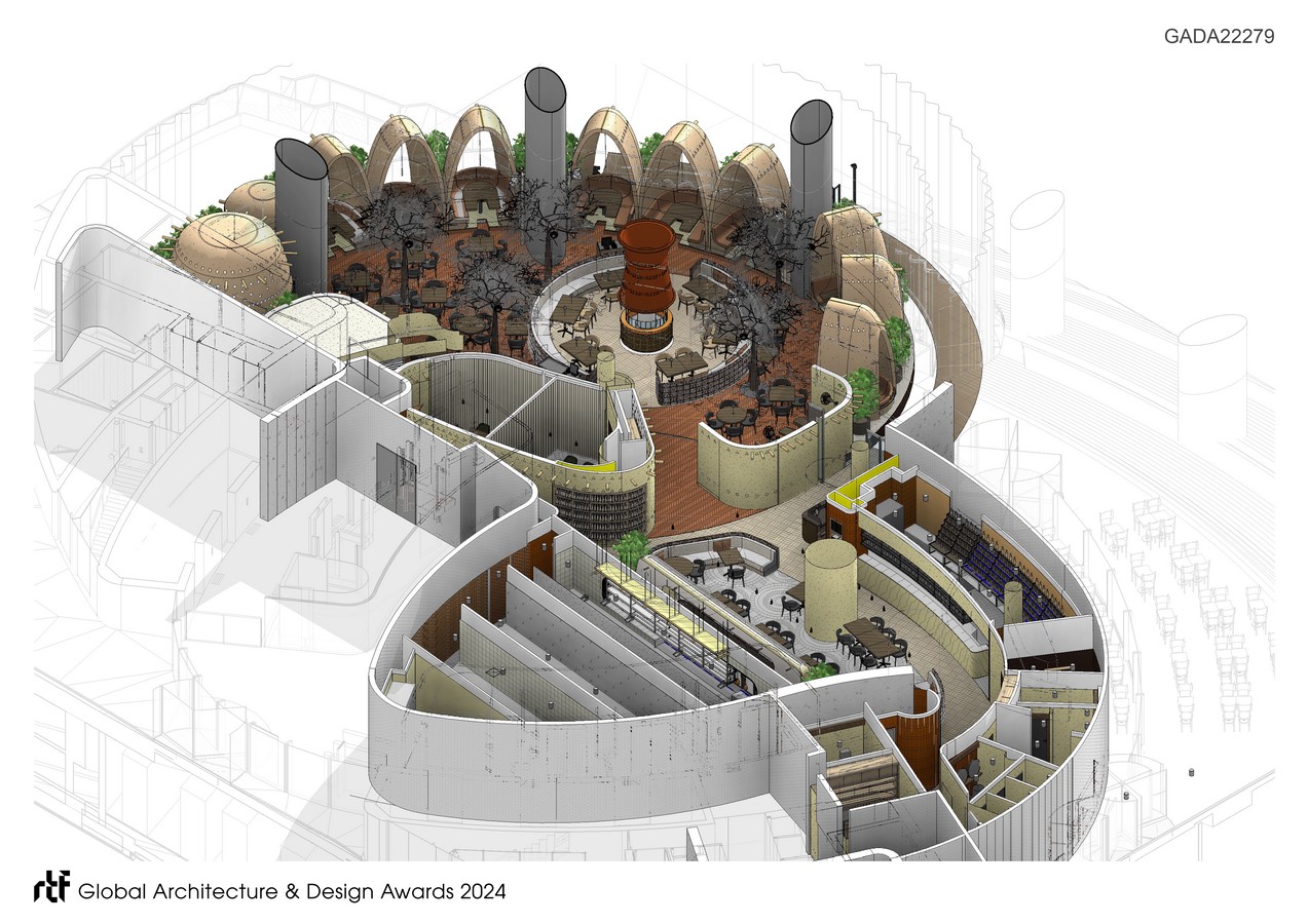 The entire village is framed within a 17m high steel mesh curtain separating the “inside from the “outside” in a very gentle, almost invisible shroud. The restaurant’s unique design combines functionality with sensory engagement. Heated booth seating within the 4,5m high Bomas (pods) keeps diners comfortable, while a cut-out in the front of the dining table allows staff to step into the table to greet guests and serve them individually. This recess design element framed with a brass edge that stand proud of the table surface, also prevents utensils from falling and enhances social interaction. Decorated clay walls, reinterpreted as soft, upholstered surfaces, add a tactile surprise, while the scent of petrichor and sounds of African poetry in the walkway sweeping up to the entrance creates a multi-sensory greeting for visitors.