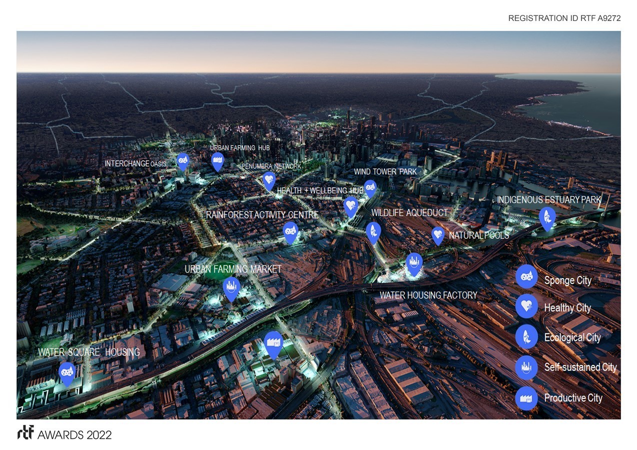 Sponge City integrates water management into urban landscapes that includes storage, recycling, re-use, adaptation and protection. Interchange Oasis exemplifies how flash floods from a covered-up urban creek can be diverted to offer spaces of respite for surrounding hospital users. Their water greens facades and roofs of an overpass with amenities.
