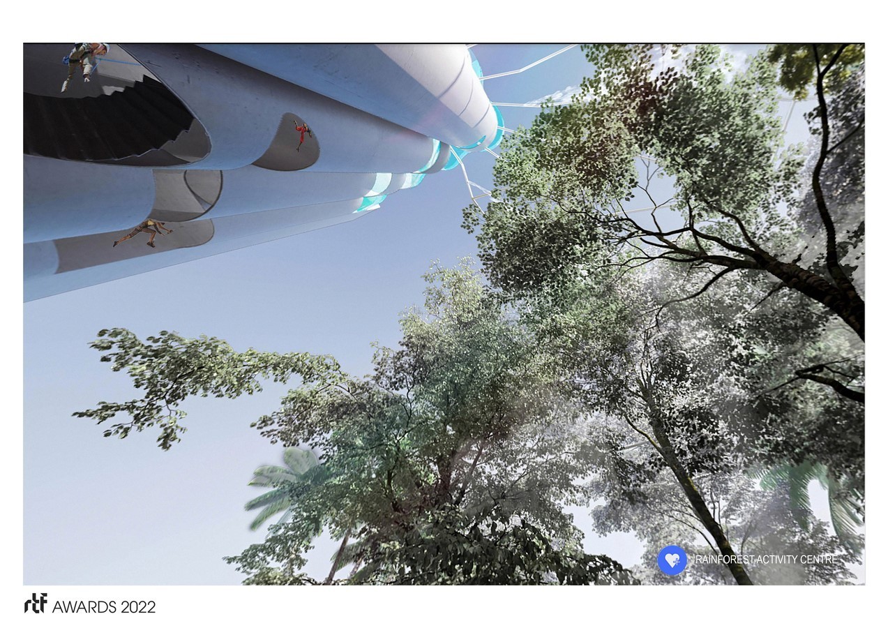 Healthy City focuses on programmes to relieve climate stress. Rainforest Activity Centre reimagines a disused silo as a shaded platform for physical activity. Energy generated by abseilers and climbers recirculates water to mist an artificial rainforest.