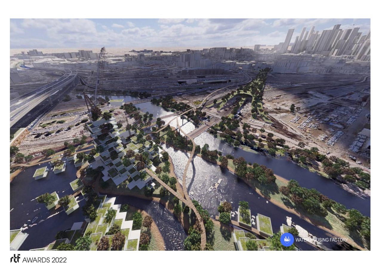 from producing and testing flood-resistant housing (the Water Housing Factory) to employing urban apiculture to pollinate vegetation and farming in the adjacent Wildlife Aqueduct.