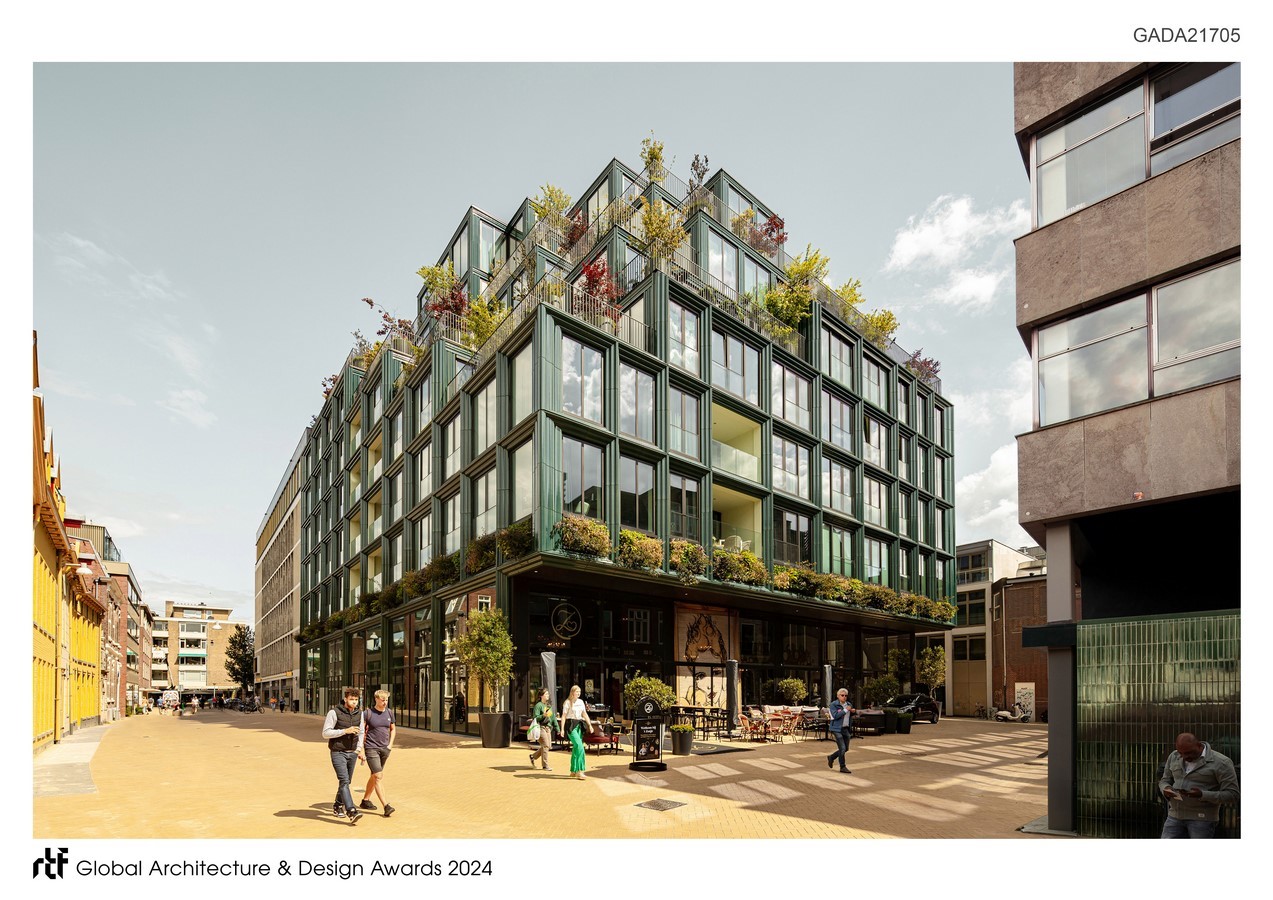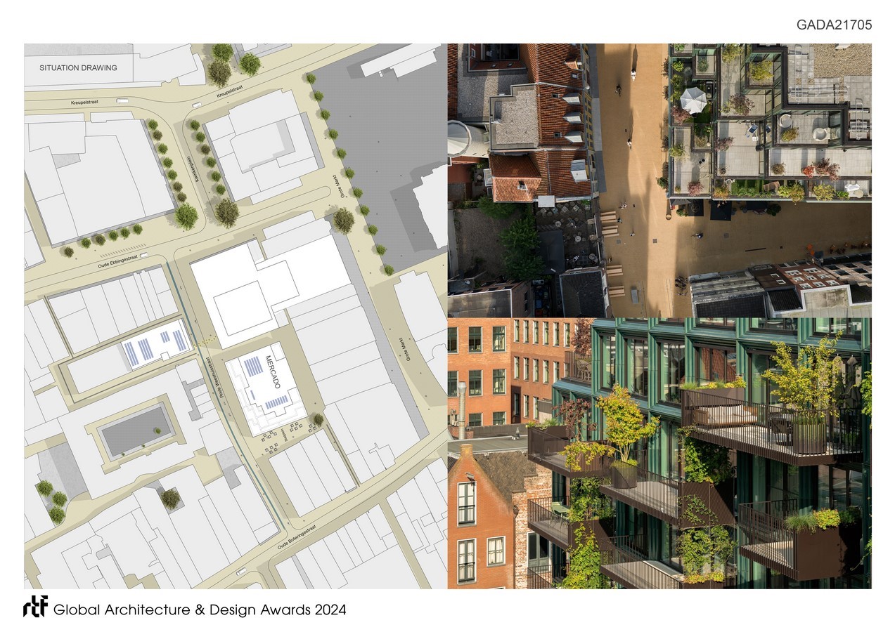 Mercado’s design and the urban plan for the Rode Weeshuisstraat were created by the architectural partnership of De Zwarte Hond and Loer Architecten for the developers MWPO and Beauvast. Mercado has a monumental plinth topped by 41 sustainable apartments.