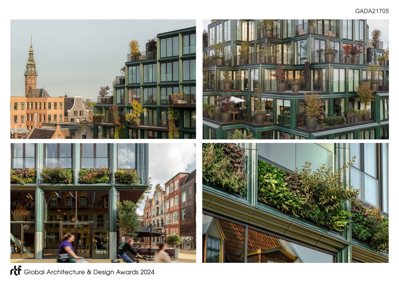 The vertical garden along the façade provides the building with 3,800 plants and contributes to biodiversity. On the south façade, the balconies are equipped with climbing plants as a green screen. The stepped volume of the building provides space for roof terraces where colourful plants and trees are part of the design. Special planters have been designed for the building with a unique colour scheme to match the building. Both the roof terraces and the façade gardens are watered by a computerized system and regularly maintained by a gardener.