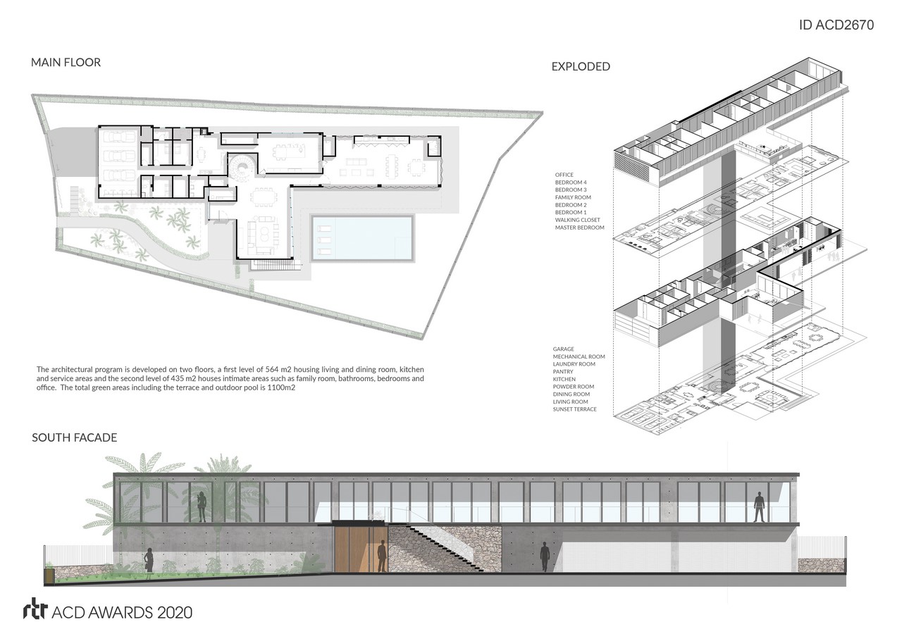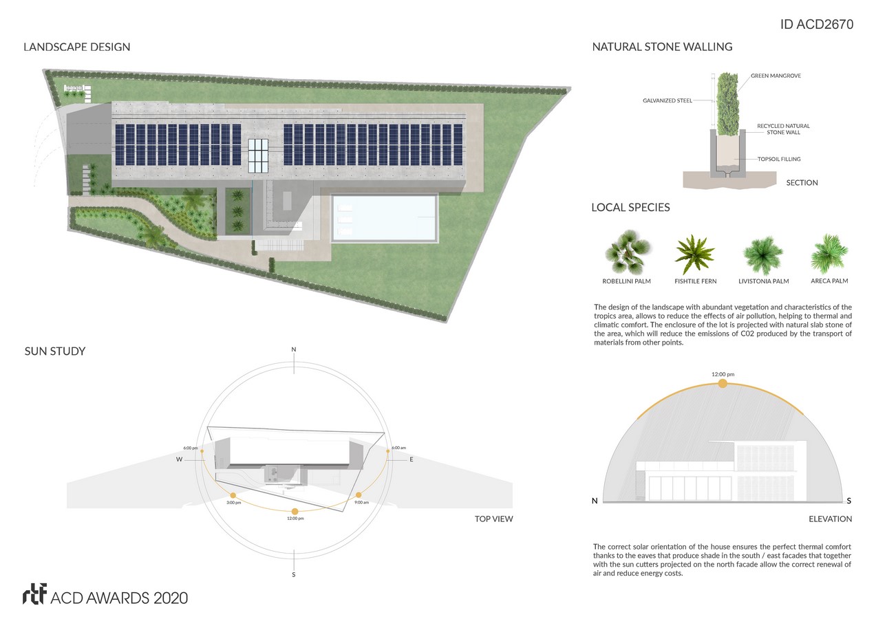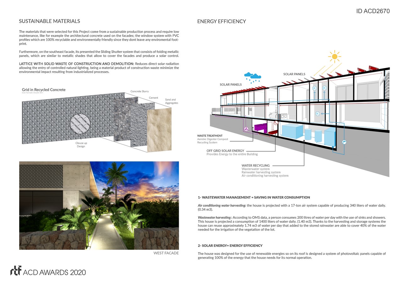 The house was designed to be energy efficient, so on its roof was designed , a system of photovoltaic panels capable of generating 100% of the energy that the house needs for its normal operation. In addition, water tanks are contemplated in a basement, capable of collecting and storing the grey water and water produced by the air conditioning equipment which will be treated and reused later for irrigation of the green areas.