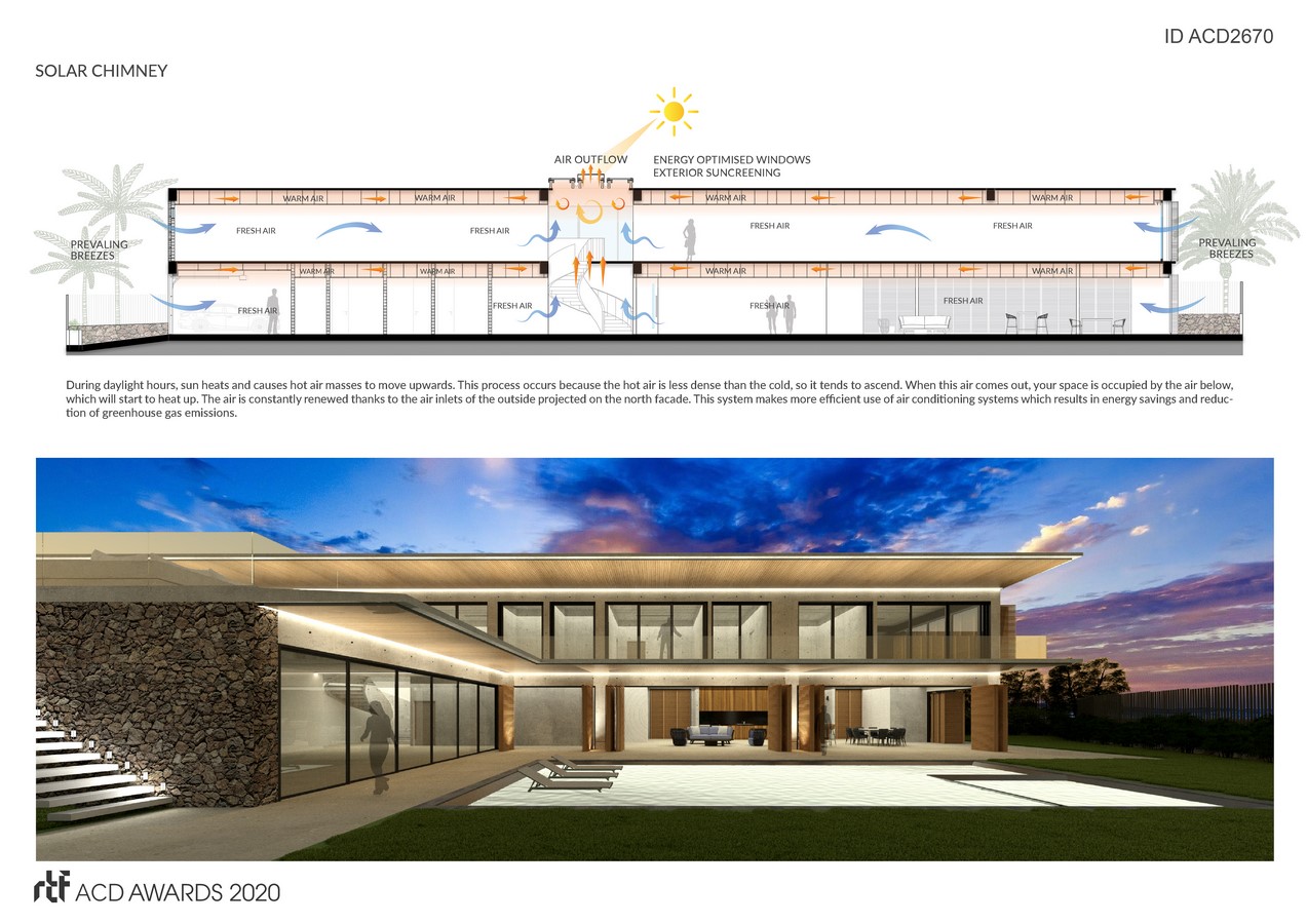 In contrast, the north facade designs a system of sun shutters in the direction of winds that allow the entry of cold air currents into the interior. To improve ventilation within the space, a natural ventilation system known as the Solar Fireplace is developed with a glass skylight in the stairwell that allows air renewal and prevents excessive use of air conditioning equipment.