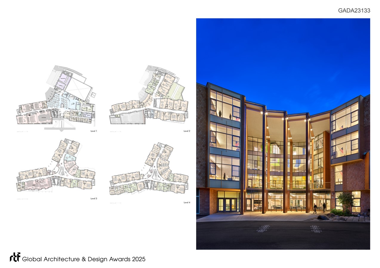 The design operationalizes a clear set of Learning Space Principles: small-scale learning communities; collaborative learning and teaching; visible learning; flexibility; community engagement; and civic placemaking. Community-accessible performing arts and athletic facilities reinforce the school’s role as a town asset, not only a building for children.