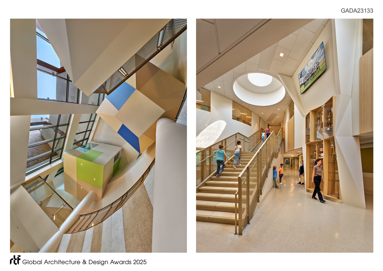A radiating floor plan organizes grade-level sub-communities along generous daylight spines and brings them together at a central, visible collaboration zone: the Learning Commons/Cafeteria atrium. This heart of the school enables “learning rather than teaching,” making project work, exhibitions, and cross-grade interaction legible and inviting. Surrounding the commons, a media center, glass-enclosed art and maker spaces, a functional lab, and distributed breakout areas support flexible, interdisciplinary instruction and student agency.