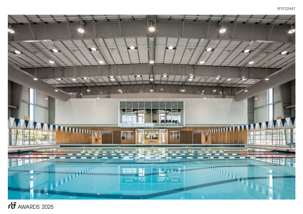 SPF:a’s solution to the community was to employ pre-engineered metal buildings and combine them with bespoke elements to create a unique, but exceptionally cost-effective space. The 40,000-square-foot project features a 23,000-square-foot pool facility, a 16,000-square-foot basketball gymnasium, a partially enclosed raised walking track, two overlook seating areas serving the tennis center and stadium, and an enclosed garden for the existing community building. The design also incorporates wide-ranging accessibility features, ensuring that the complex is welcoming to people of all ages and abilities.