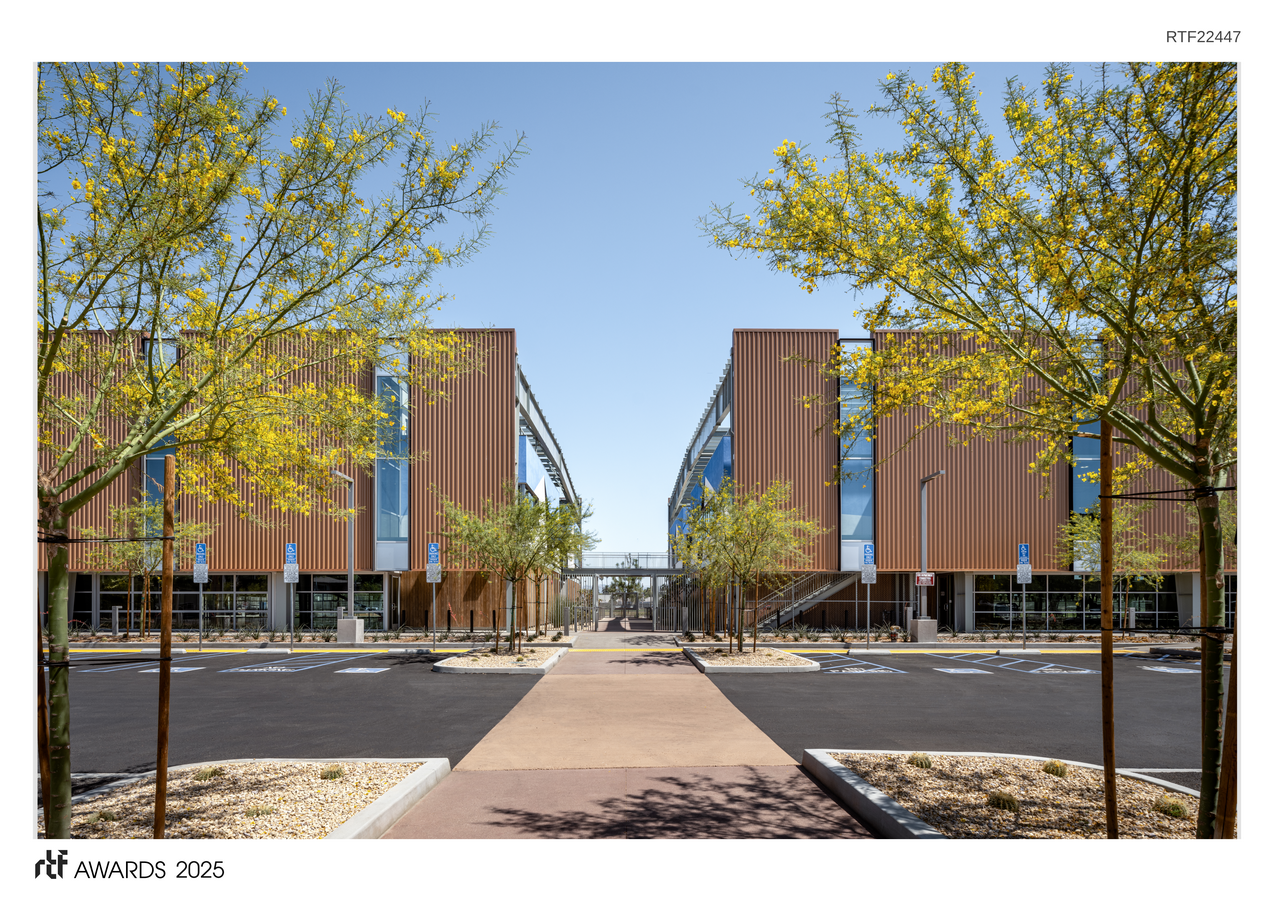 The landscaping plot includes five distinct ecologies: high desert, canyon, coastal, chaparral, and medicinal, all implemented in a grid-like pattern. These spaces are extended to tie the buildings together and provide the visitors with usable parkland in the voids between each facility.