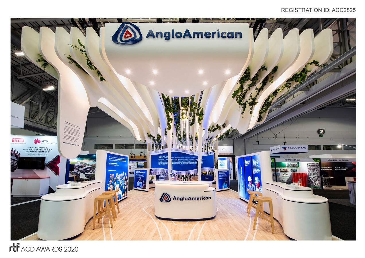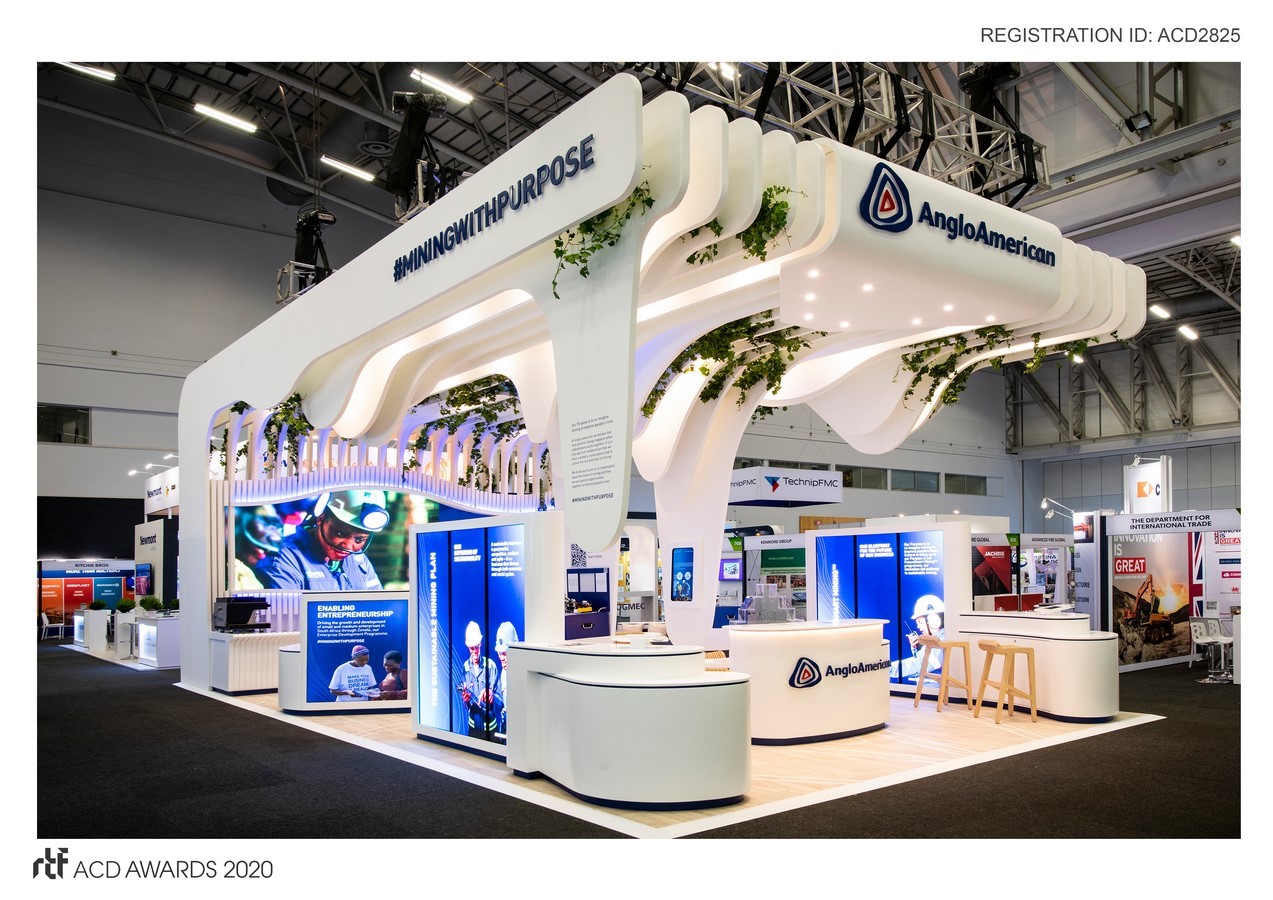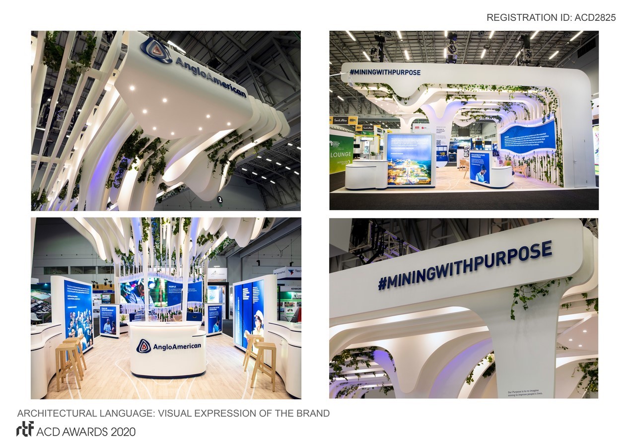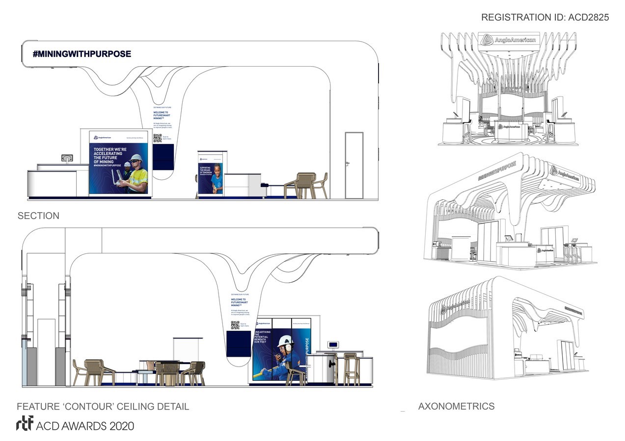 The Anglo American brand is well-known. The contour ‘A’ logo, the clean white identity accented by contours of the earth are recognised by those in the industry. The style of the exhibition stand would be informed by turning these brand assets into the architectural language.