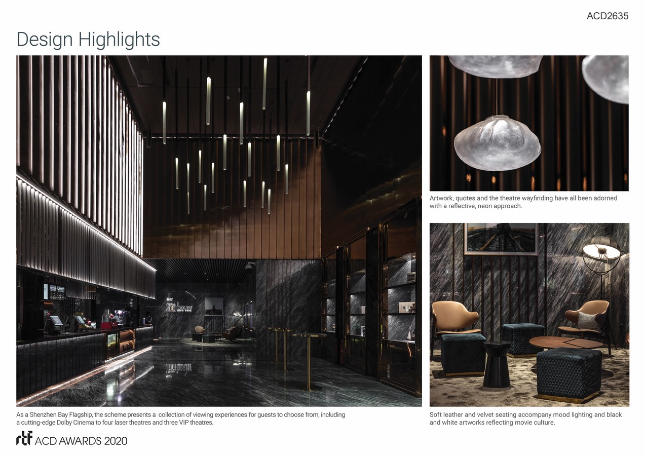 Covering over 3,400sqm, the design took inspiration from the luxury hotel industry, bringing a distinctive, premium and immersive experience with a user-centric approach; a design befitting the cinema’s status as the anchor leisure and entertainment offer for the wider 80,000sqm MixC Shenzhen Bay retail development.
