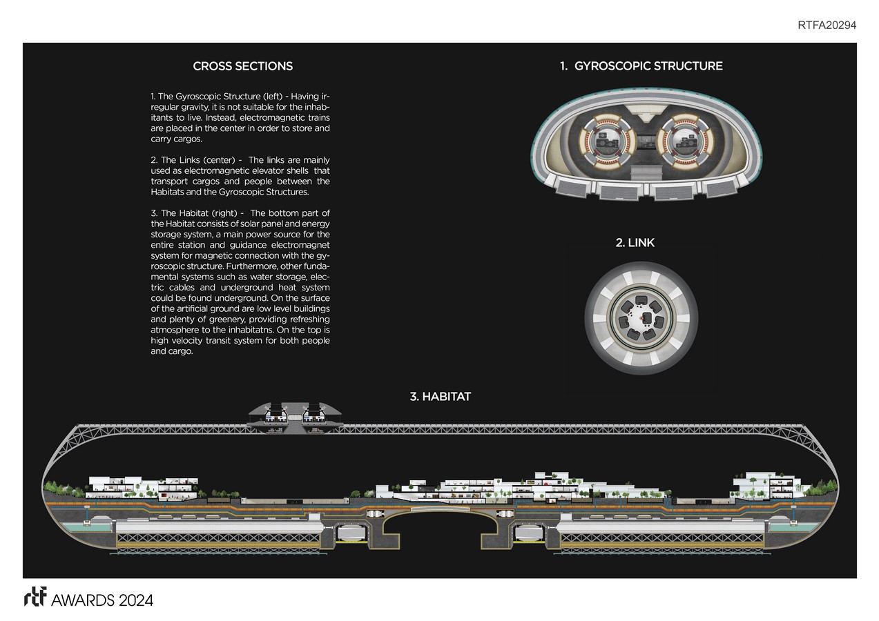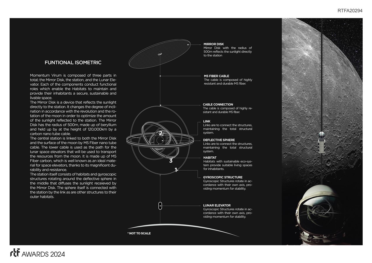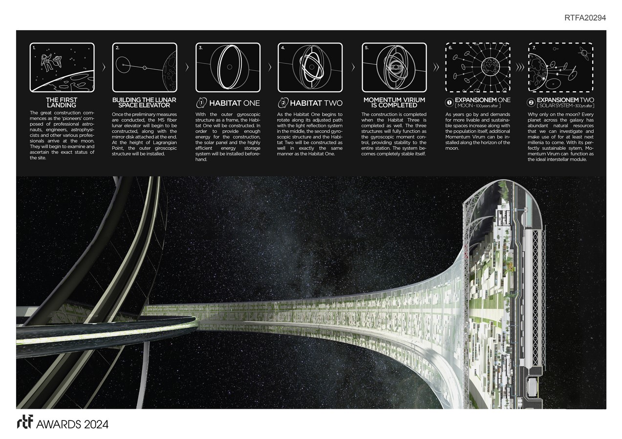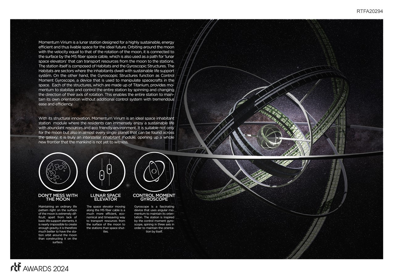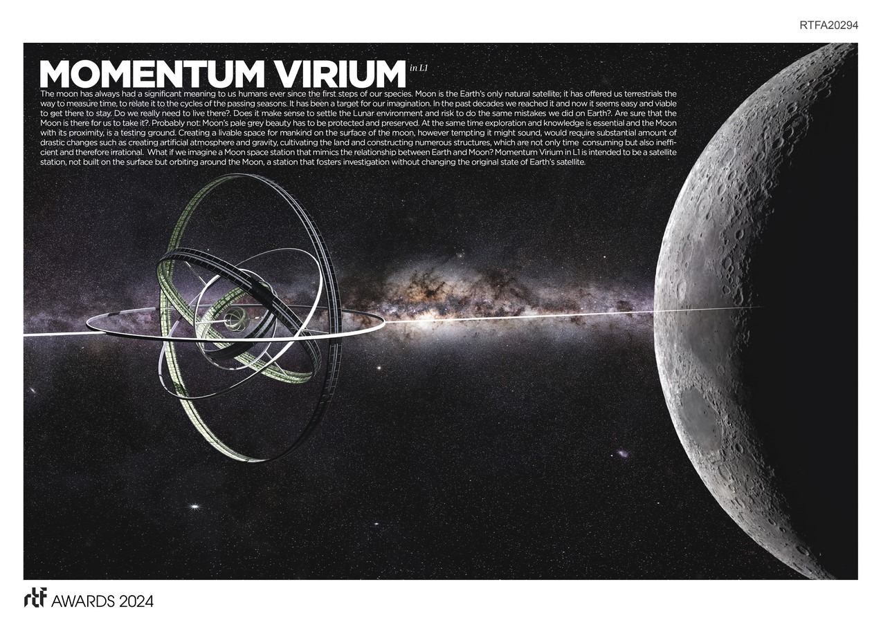 Momentum Virium is a space habitat orbiting the moon. It works as a gyroscope and consists of three rotating circular rings.