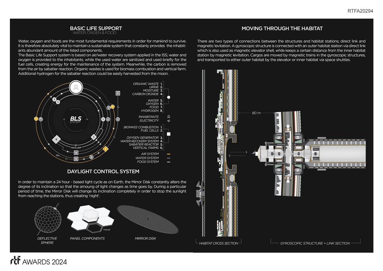 In the design, we adopted the same Environmental Control and Life Support System (ECLSS) used at the International Space Station where the water is produced by both the Sabatier Reactor and the Fuel Cells. As for the energy required, we need to consider the energy needed to make the rings spin that is estimated to be 0.11 Gwatts. Regarding the energetic needs of the station, we’ve calculated an amount of energy of about 0.52GWatts.