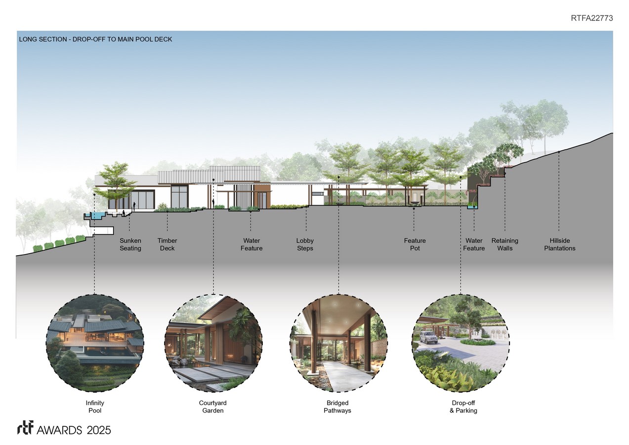 The design is a quiet yet bold architectural gesture—an environmentally-conscious retreat that responds intimately to its site’s steep terrain, unique microclimate, and cultural identity.