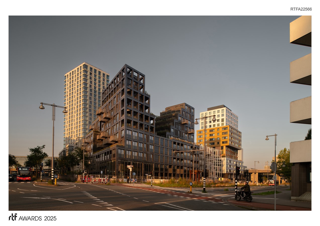 The dark, glossy brick façade contrasts with surrounding buildings and lends the structure a monumental identity—appropriate for its central location. The building stands at a key intersection and plays a defining role in Sloterdijk’s transformation. It forms a cohesive ensemble with Tracks 6 and 9, furthering social cohesion through co-development. Together, they contribute to the shift from a mono-functional office area to a mixed-use, people-focused neighbourhood.
