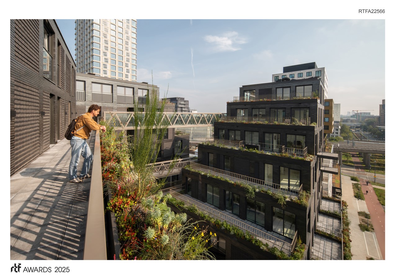 Sustainability plays a central role in Track 8, aligned with Haven-Stad’s long-term ambitions. Greenery is integrated on all levels: façade planters, rooftop gardens, and ground-level planting support biodiversity. Rainwater is stored in a 260 m³ basin for irrigation. Solar energy is generated via integrated cells in the glass balustrades. These features reduce environmental impact while enhancing comfort and livability.