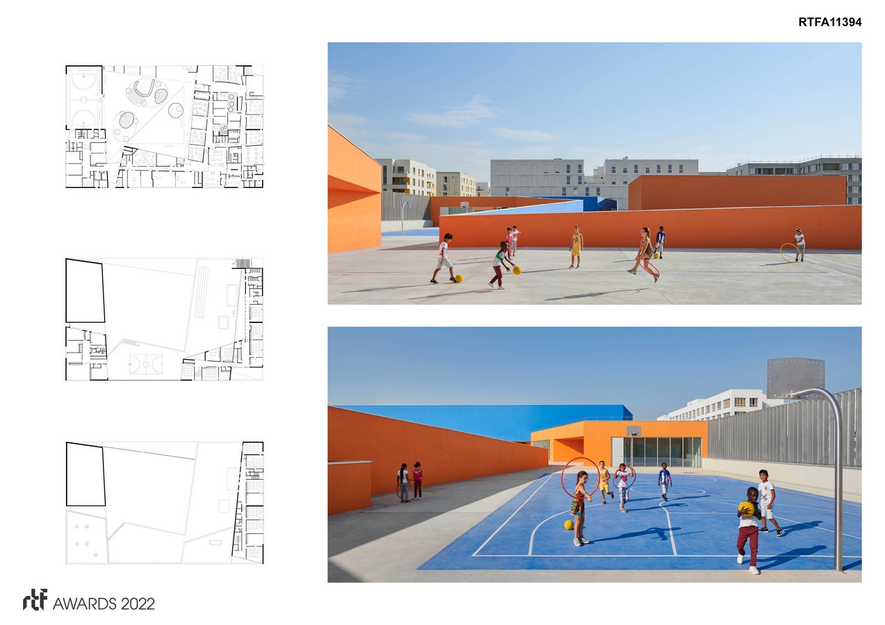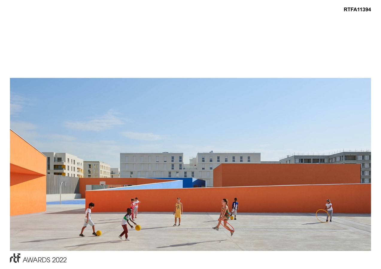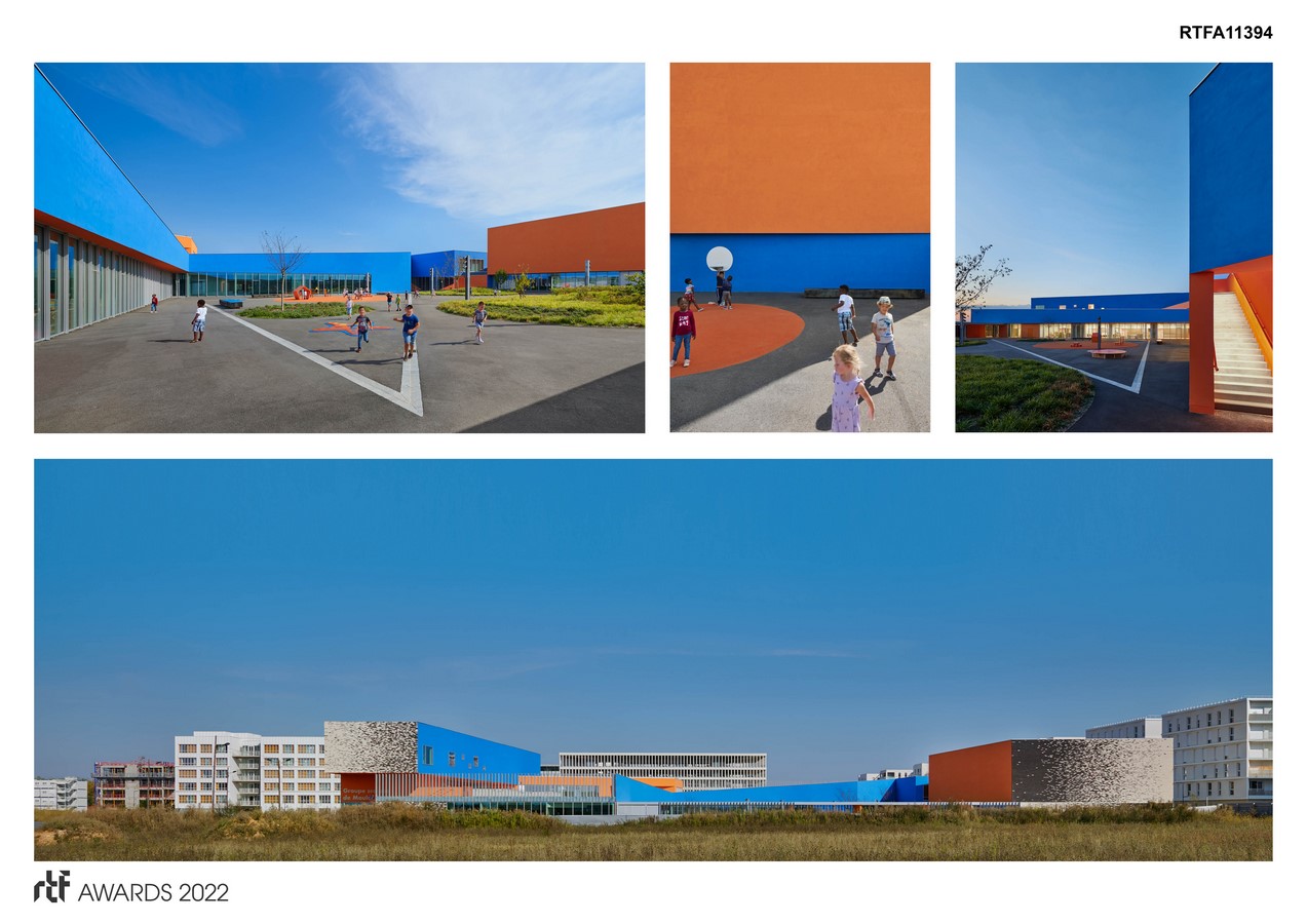 They contrast both with the environment, but also with the heart of the building, rich in colors, of a blue and a frank orange whose identity is reinforced through a sure game of obliques : as much in plan as in section, for the exeriors as well as the interiors, we engaged in an endeavor in order to leave in orthonormal system.