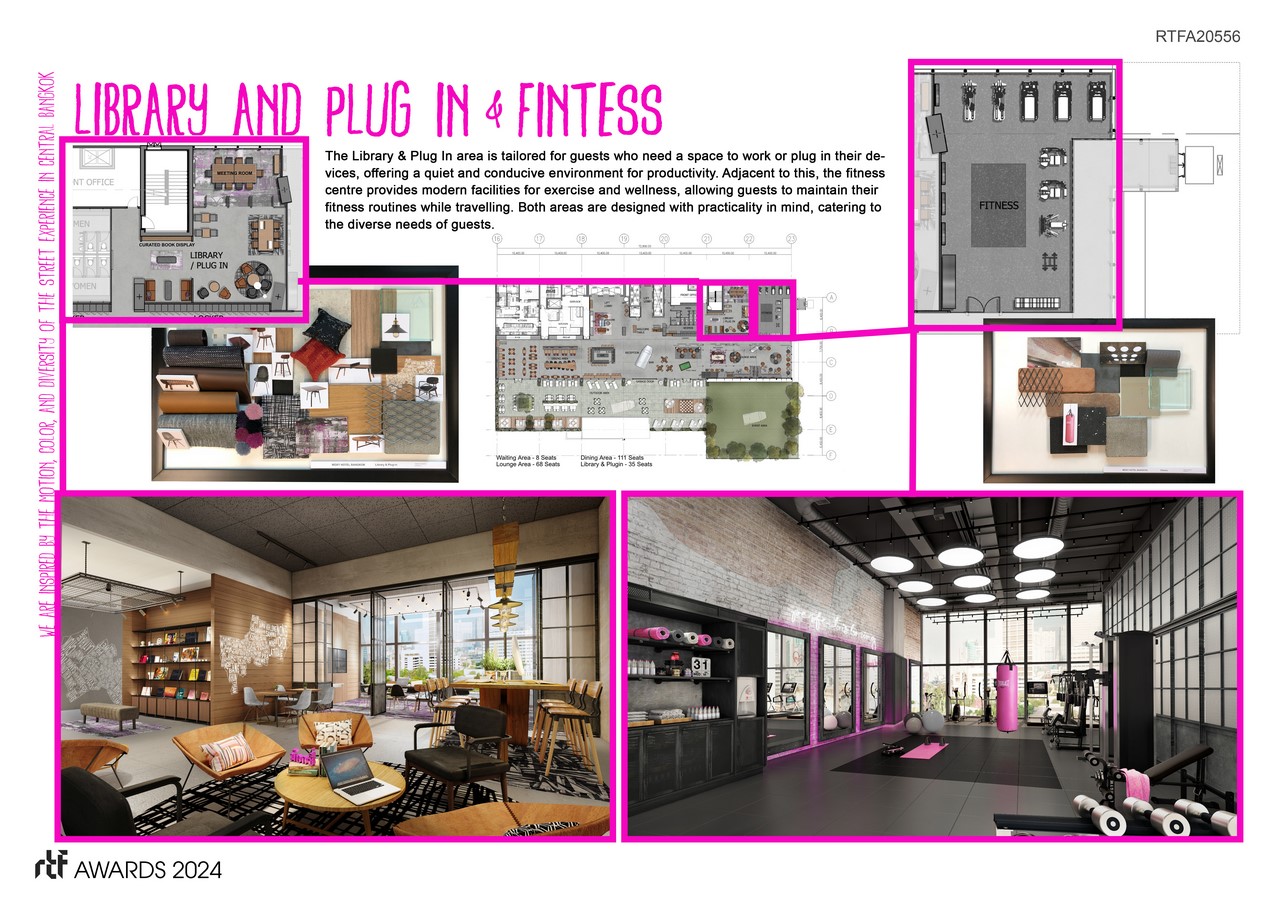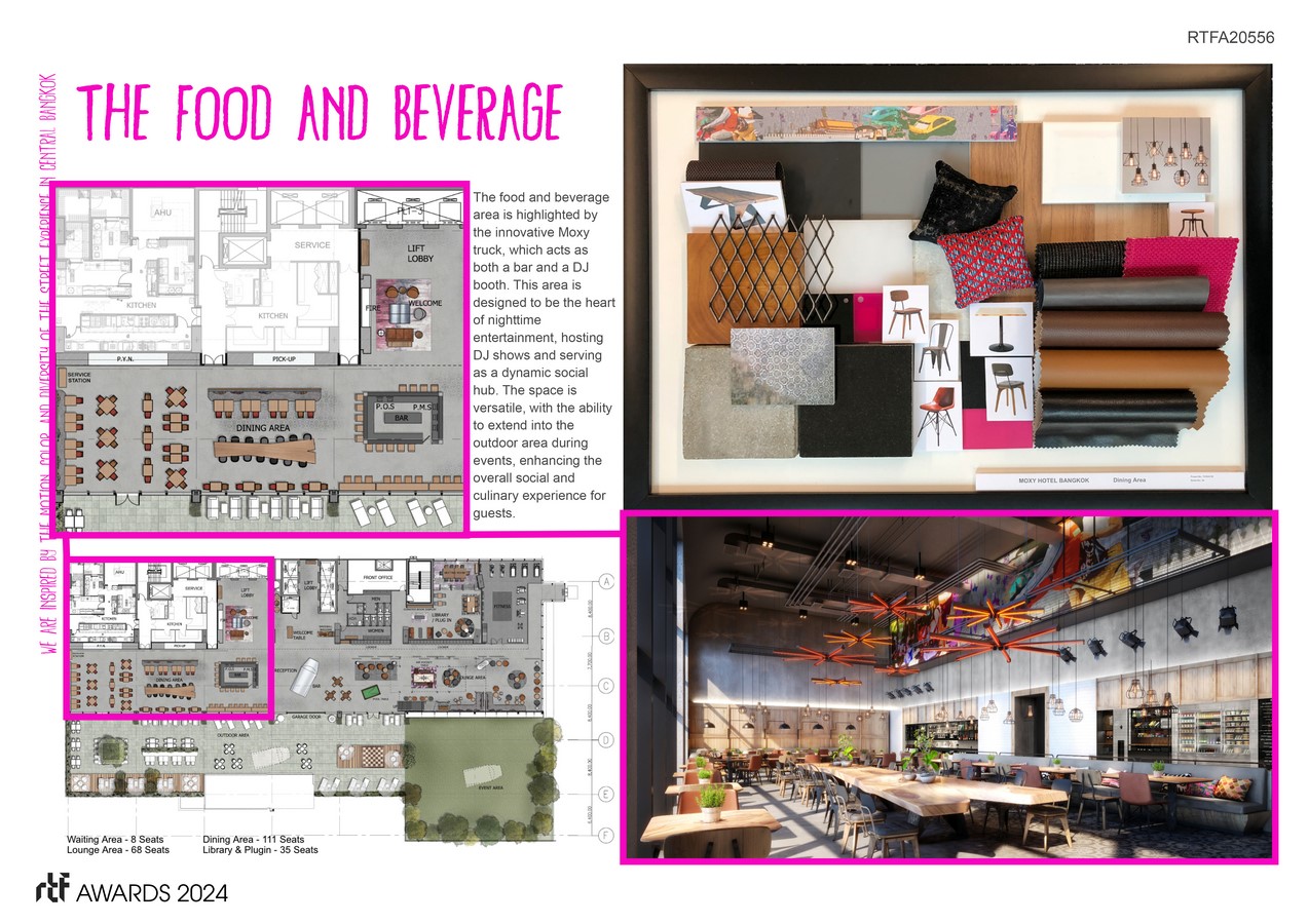 Inspired by the kinetic energy and vibrant diversity of Bangkok’s street life, our “Heart of Bangkok” concept immerses guests in a dynamic environment that reflects the city’s vibrant urban landscape. This theme is intricately woven through every design choice, from the layout to material selection, creating a memorable atmosphere that resonates with Moxy’s youthful demographic.