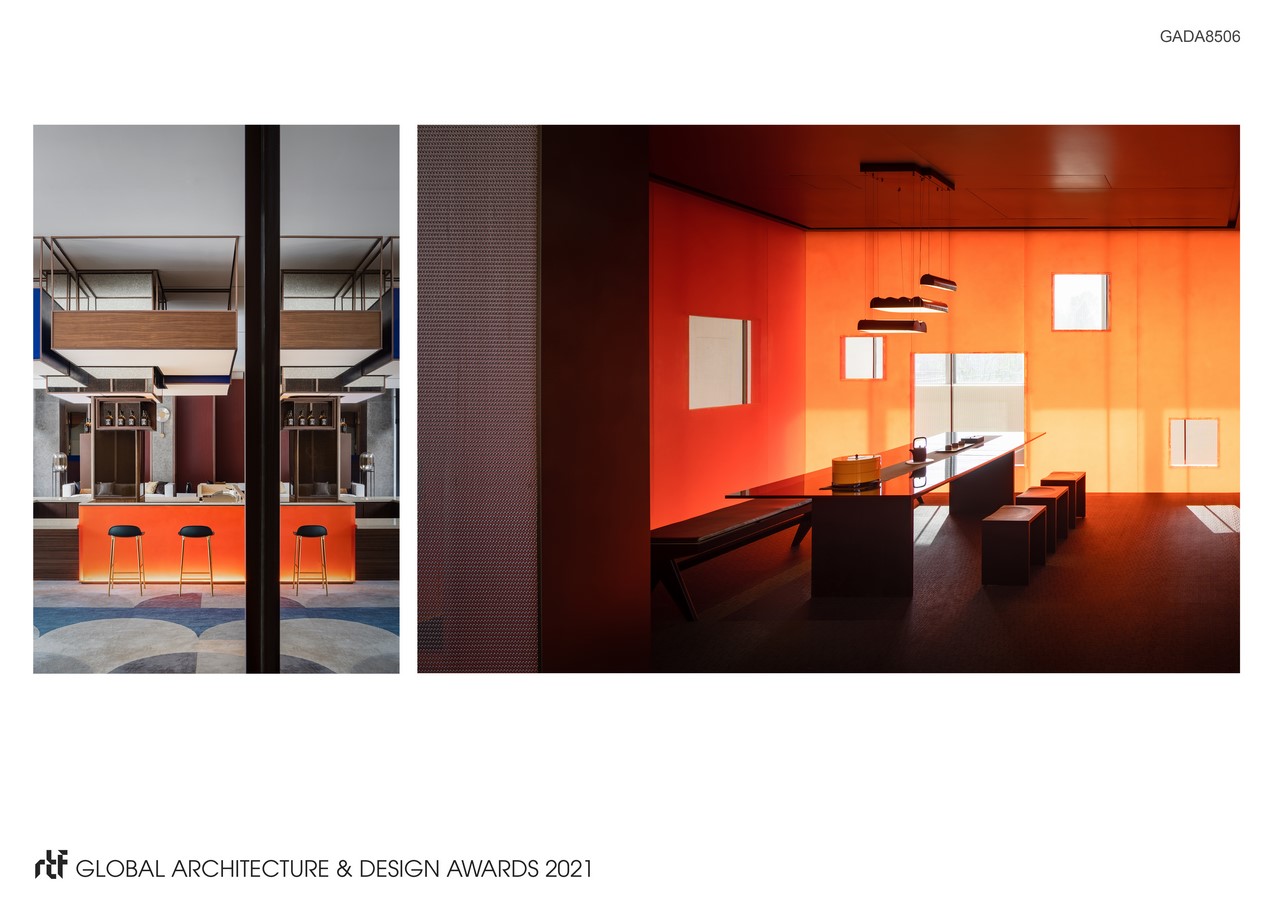 In line with Maslow’s hierarchy of needs model, after the lower two floors meet the needs of belonging and respect, the top floor undertakes the ultimate self-realization of the building. Above the center of the art exhibition hall, the orange diverticulum stands out in an extremely eye-catching manner. As the apex of the consciousness of the building community, this beating “heart” and the roof landscape work hand in hand to create the space center, radiating energy to the surroundings.
