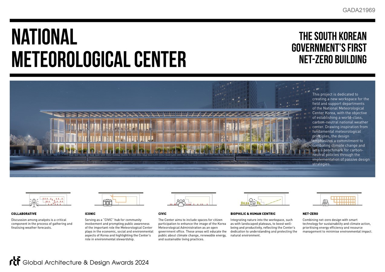 The National Meteorological Center, located in Daejeon and comprising 8900 sqm of mixed-use workspace across three floors and a primary control centre, is South Korea’s first government building designed to meet net-zero emissions standards.