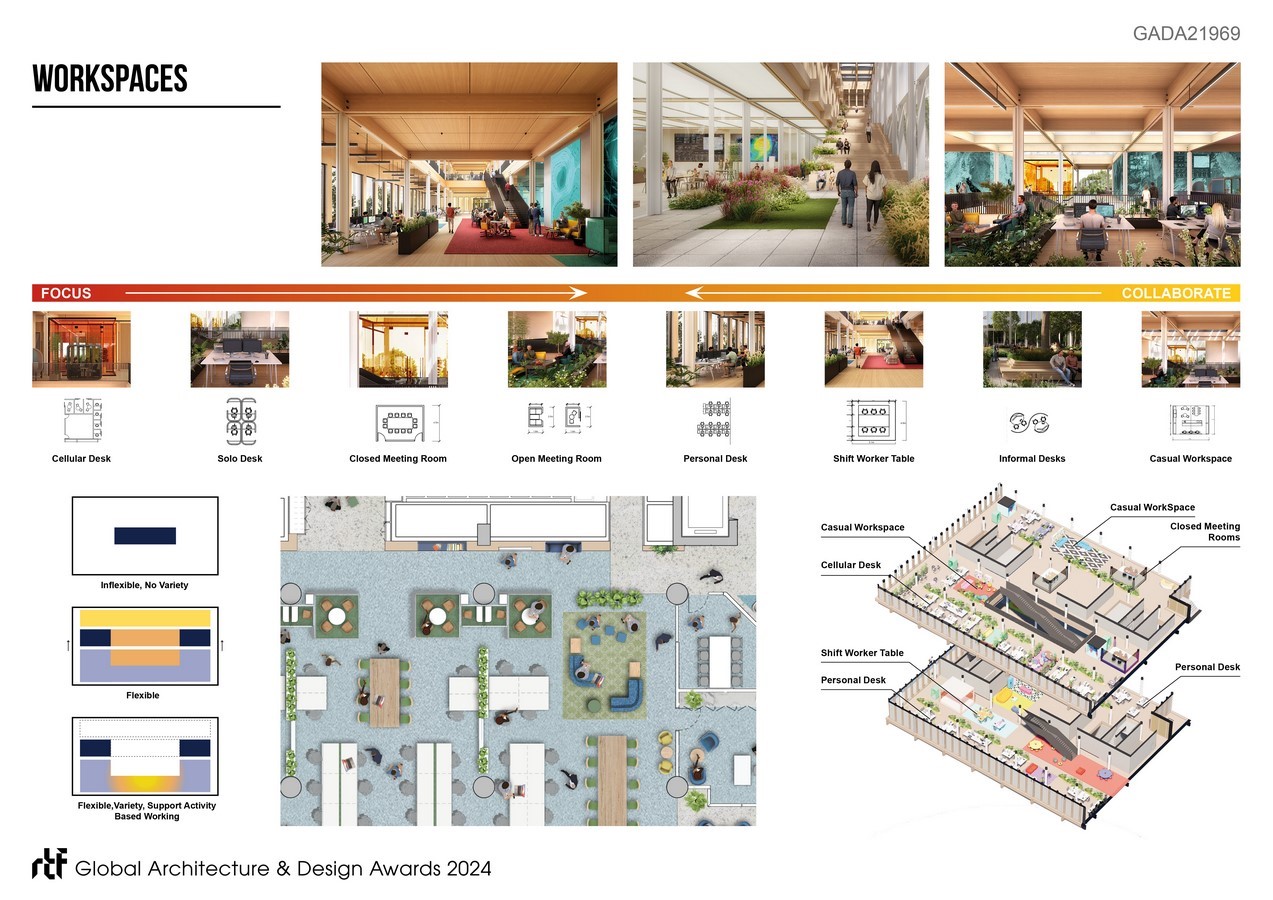 At the core of the Center’s design is the innovative “box in a box” concept, which enhances thermal efficiency and creates the form for a diverse range of functions, spaces and atmospheres within a unified aesthetic framework. This design strategy creates a controlled microclimate, which enables a vibrant four seasons garden to flourish throughout the year, embodying the project’s biophilic approach. This connection to nature not only boosts the well-being of occupants but also serves an educational role, promoting environmental stewardship to the public.