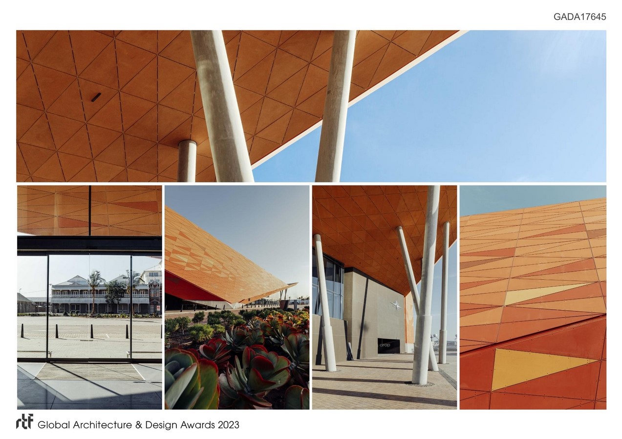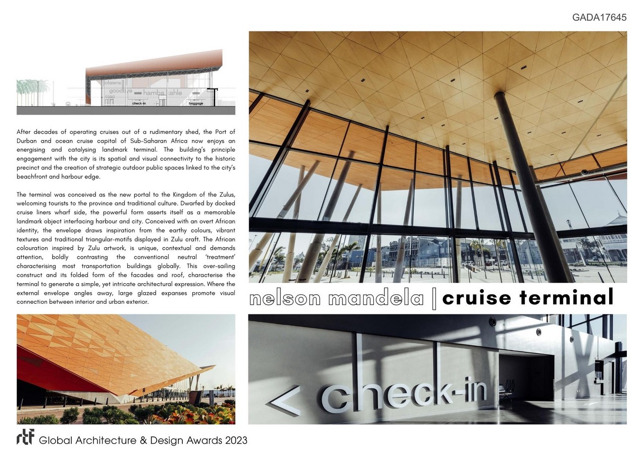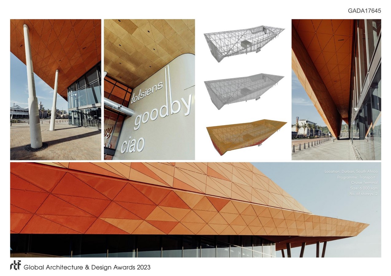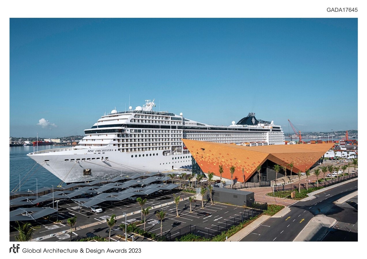 The terminal was conceived as the new portal to the Kingdom of the Zulus, welcoming tourists to the province and traditional culture. Dwarfed by docked cruise liners wharf side, the powerful form asserts itself as a memorable landmark object interfacing harbour and city. Conceived with an overt African identity, the envelope draws inspiration from the earthy colours, vibrant textures and traditional triangular-motifs displayed in Zulu craft. The African colouration inspired by Zulu artwork, is unique, contextual and demands attention, boldly contrasting the conventional neutral ‘treatment’ characterising most transportation buildings globally. This over-sailing construct and its folded form of the facades and roof, characterise the terminal to generate a simple, yet intricate architectural expression. Where the external envelope angles away, large glazed expanses promote visual connection between interior and urban exterior.