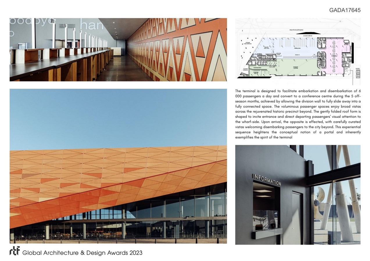 The terminal is designed to facilitate embarkation and disembarkation of 6 000 passengers a day and convert to a conference centre during the 5 off-season months, achieved by allowing the division wall to fully slide away into a fully connected space. The voluminous passenger spaces enjoy broad vistas across the rejuvenated historic precinct beyond. The gently folded roof form is shaped to invite entrance and direct departing passengers’ visual attention to the wharf-side. Upon arrival, the opposite is effected, with carefully curated vistas welcoming disembarking passengers to the city beyond. This experiential sequence heightens the conceptual notion of a portal and inherently exemplifies the spirit of the terminal.