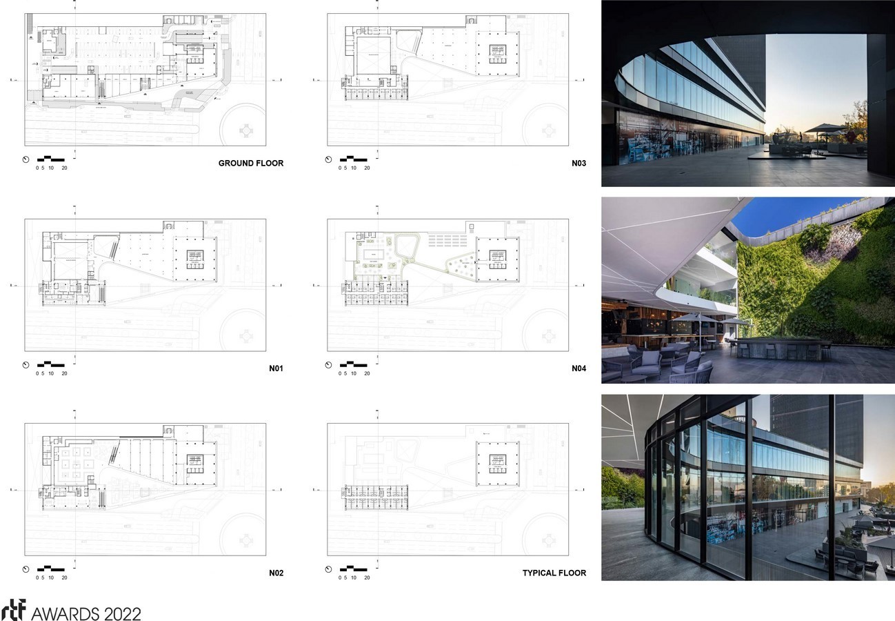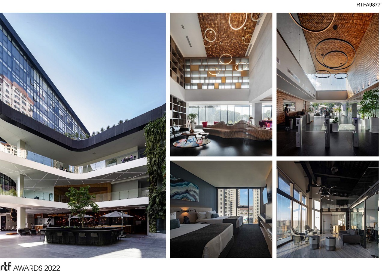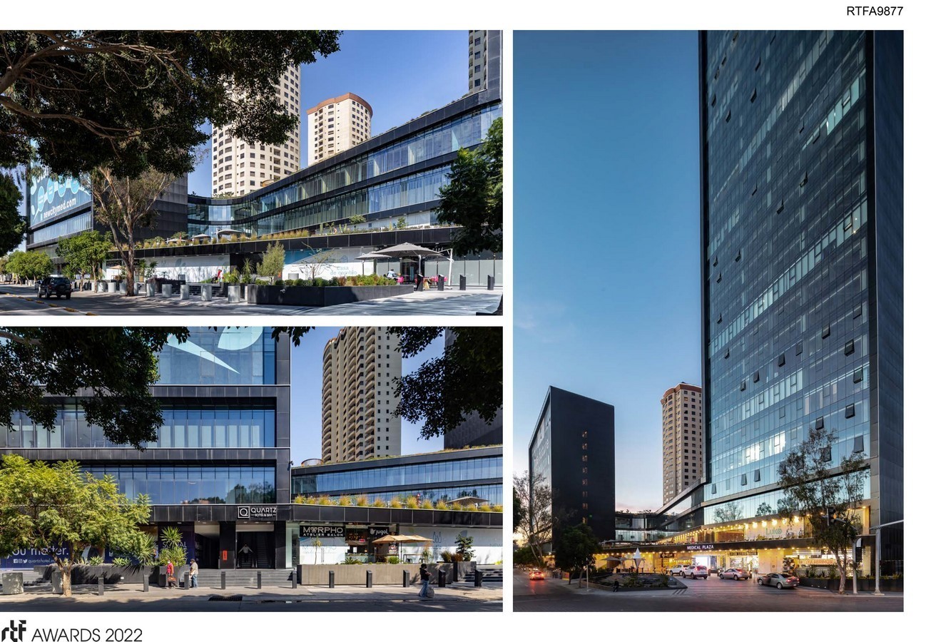 The design seeks to create public space in two layers, the first given by the public square at street level and the second the commercial square on the first level, this elevated square which is accessed from the avenue is an invitation to the user to enter in the project and its elevation intentionally relates the central body of the complex with the existing vegetation in its immediate context.