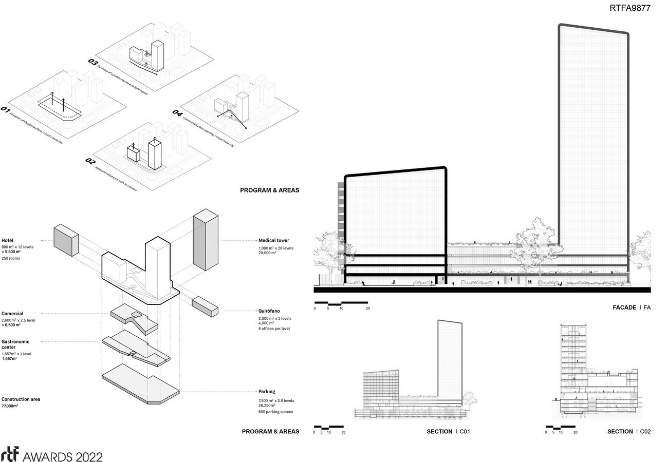 The difference in the uses of the architectural program volumetrically creates two displaced towers on the same axis and in opposite locations on the land that are linked by a central body that houses the public use areas and the commercial plaza. The volumetry was the response to the complex variables involved in the design of a building with so many different uses, hospital logistics dictates different specifications at the structural level, as well as the entry mechanisms and the management of hospital waste and waste, all these conditions They were able to be solved without altering the architectural language, physically separating this area from the rest of the complex.