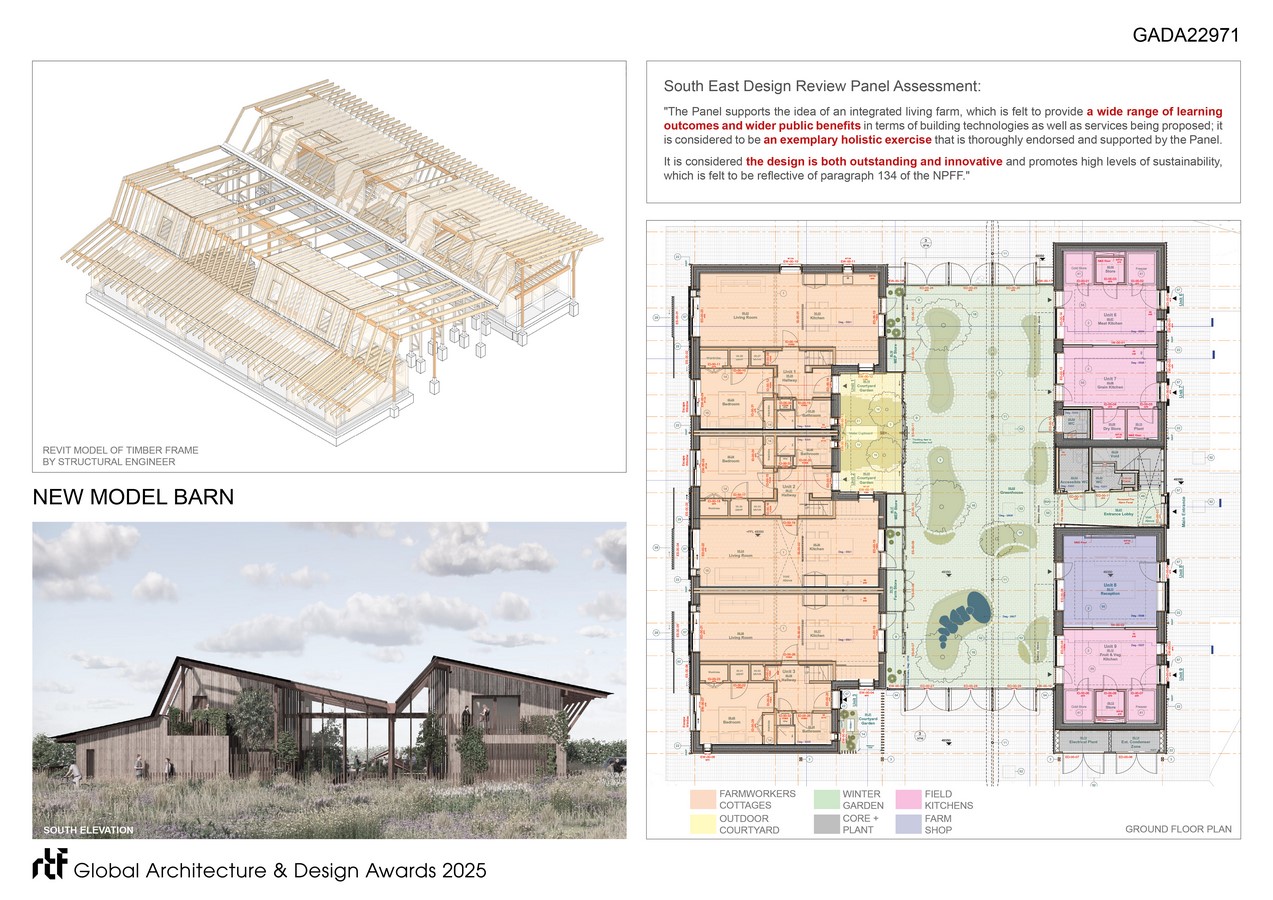 In collaboration with the client the brief has been extended to create New Model Barn – a large agricultural roof that accommodates several different programmes beneath, comprising 3no. field kiitchens at ground floor to process meat, grains and fruit; a farm shop; 3no. farmworkers’ cottages; 2no. first-floor units for flexible use (visitor apartments / office / conference room); and a communal multi-purpose greenhouse at the centre of the plan that can be used by the whole building including a wide range of visiting groups.