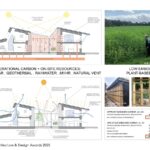 In terms of operational resources: the central greenhouse is a passive solar space during winter and the shoulder seasons; PV solar and batteries contribute to an all-electric power system; ground source heat pump array and MVHR provide winter heating; passive ventilation and shading avoids summer overheating; on-site drainage field processes grey and black water; on-site landscaped infiltration pond absorbs rainwater run-off.