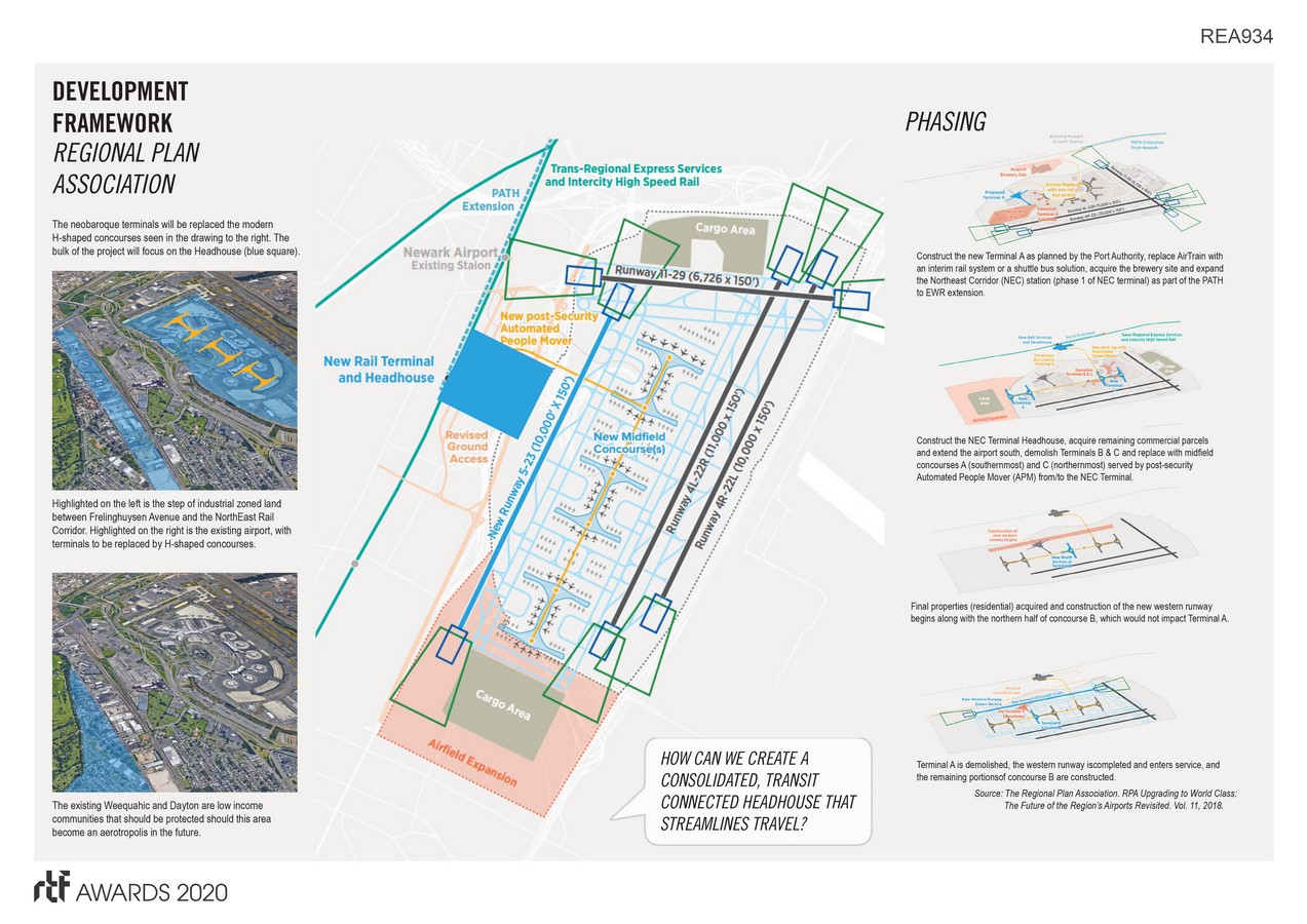The framework for this project is the research done by the Regional Plan Association, which proposed that the best way to address the issues in EWR was to do the following: replace the neo-baroque style terminals with modern, H-shaped midfield concourses with connection by automated people movers, and construct the Headhouse on the Northeast Rail Corridor.