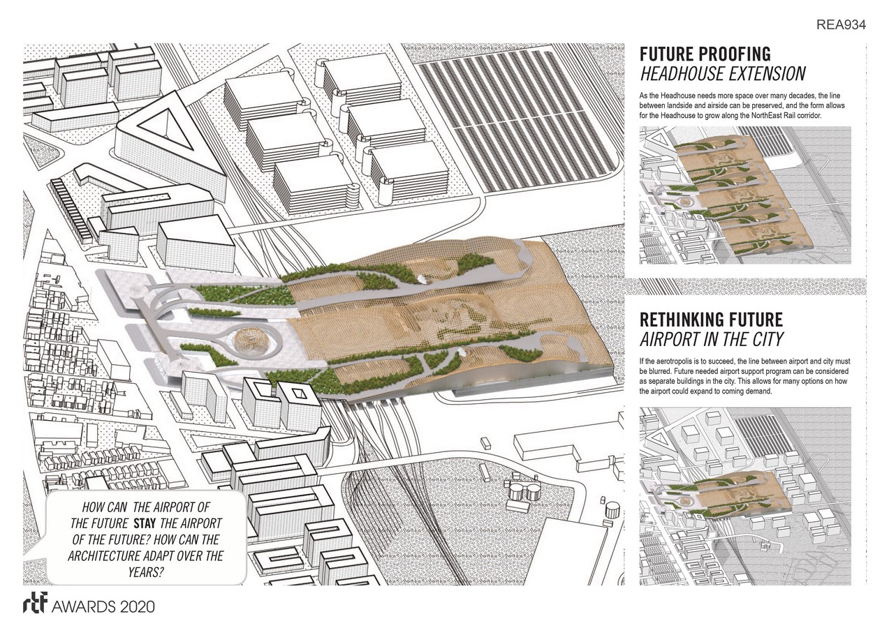 The project uses this rail access and a consolidated terminal to explore ideas defined by economic analyst John Kasarda, the Aerotropolis. The metropolis is a conceptual type of urban form, with the airport as the center of the metropolis. This project applies the concept of the metropolis and proposes that the “Airport of the Future” is one that brings economic development to the community that it serves. It proposes that the airport of the future should not be governed by fear and “security theater” that runs modern airports, but that it should be a place for community engagement, job opportunities and a catalyst to neighborhood development and benefit.